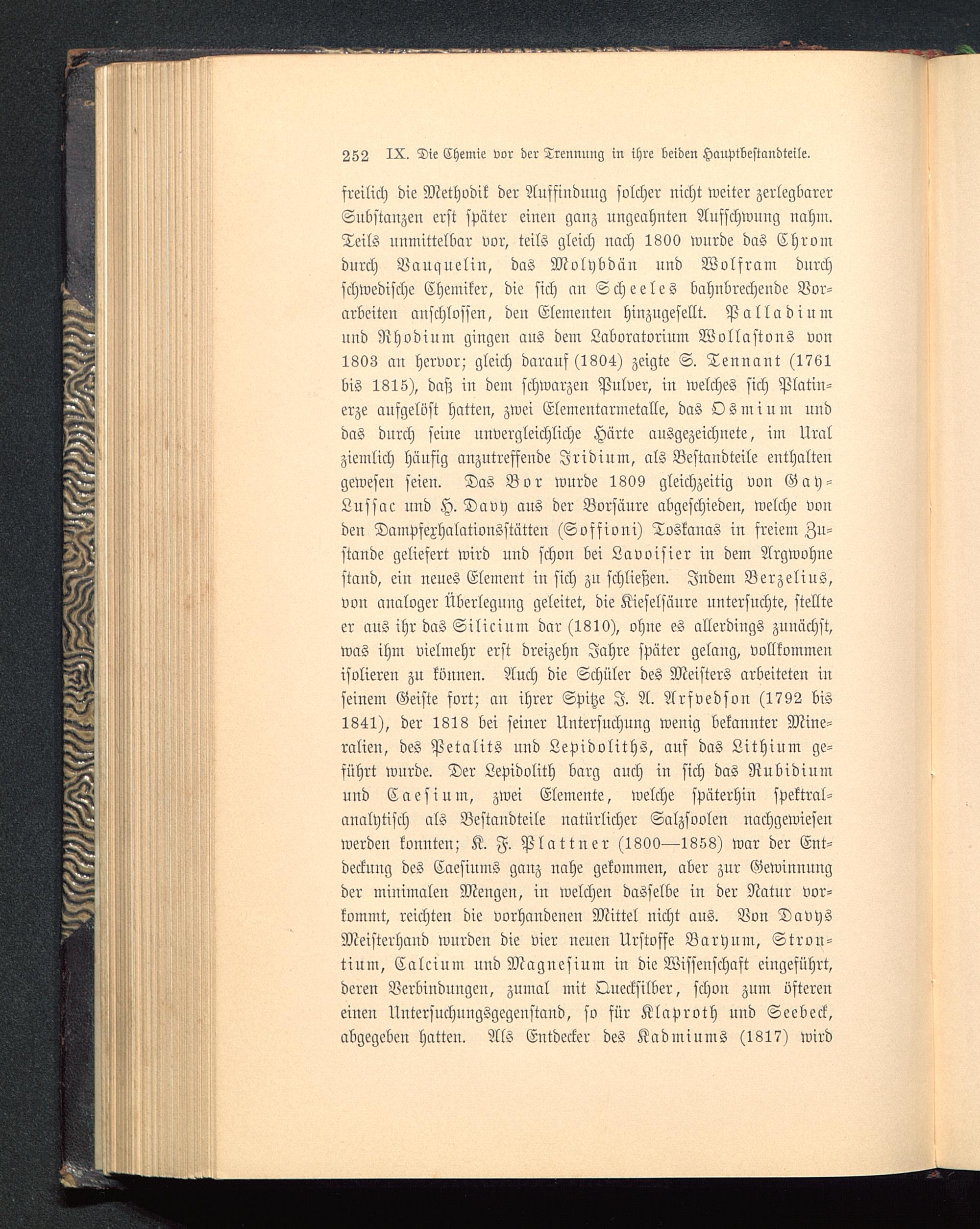freilich die Methodik der Auffinduug solcher nicht weiter zerlegbarerSubstanzen erst später einen ganz ungeahnten Aufschwung nahm.Teils unmittelbar vor, teils gleich nach 1800 wurde das Chromdurch Vauquelin, das Molybdän nnd Wolfram durchschwedische Chemiker, die sich an Scheeles bahnbrechende Vor-arbeiten anschlössen, den Elementen hinzugesellt. Palladiumuud Rhodium gingen aus dem Laboratorium Wollastons von1803 au hervor; gleich darauf (1804) zeigte S. Tennant (1761bis 1815), daß in dem schwarzen Pulver, iu welches sich Platin-erze aufgelöst hatten, zwei Elementarmetalle, das Osminm unddas durch seiue unvergleichliche Härte ausgezeichnete, im Uralziemlich häufig anzutreffende Iridium , als Bestandteile enthaltengewesen seien. Das Bor wurde 1809 gleichzeitig von Gay-Lussac und H. Davy aus der Borsäure abgeschieden, welche vonden Dampfexhalationsstätten (Sofsioni) Toskanas in freiem Zu-stande geliefert wird und schon bei Lav visier in dem Argwohnestand, ein neues Element in sich zn schließen. Indem Berzelius ,vou aualoger Überlegung geleitet, die Kieselsäure untersuchte, stellteer aus ihr das Silicium dar (1810), ohne es allerdings zunächst,was ihm vielmehr erst dreizehn Jahre später gelang, vollkommenisolieren zu können. Auch die Schüler des Meisters arbeiteten inseinem Geiste fort; an ihrer Spitze I. A. Arfvedson (1792 bis1841), der 1818 bei seiner Untersuchung wenig bekannter Mine-ralien, des Petalits und Lepidoliths, ans das Lithinm ge-führt wurde. Der Lepidolith barg auch in sich das Rubidiumund Caesium, zwei Elemente, welche späterhin spektral-analytisch als Bestandteile natürlicher Salzsoolen nachgewiesenwerden konnten; K. F. Plattner (1800—1858) war der Ent-deckung des Caesiums ganz nahe gekommen, aber zur Gewinnungder minimalen Mengen, in welchen dasselbe in der Natur vor-kommt, reichten die vorhandenen Mittel nicht aus. Von DavysMeisterhand wurden die vier ueuen Urstoffe Baryum , Stron-tium, Calcium und Magnesium iu die Wissenschaft eingeführt,deren Verbindungen, zumal mit Quecksilber, schon zum öftereueinen Untersuchuugsgegenstand, so für Klaproth und Seebeck,abgegeben hatten. Als Entdecker des Kadmiums (1817) wird