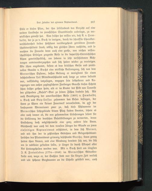 Stile er diesen Plan, der ihm selbstredend den Verzicht ans eineweitere Laufbahn im preußischen Staatsdienste auferlegte, zu ver-wirklichen gewußt hat. Von früher her wissen wir, daß A. v. Hum-boldt, der ja zu v. Buch in innigem, durch die schroffste Charakter-verschiedenheit beider höchstens vorübergehend getrübtem Freund-schaftsverhältnis stand, völlig den gleichen Ideen nachlebte, und somachten die Freunde denn auch eine große, von reichen wissen-schaftlichen Erfolgen zeugende Reise in die bayerisch-österreichischenAlpen gemeinschaftlich, nm sodann in sehr verschiedenen Rich-tungen auseinanderzugehen und sich später wieder zu vereinigen.Wie schon angedeutet, kostete es dem kritischen Geiste und pietät-vollen Gemüte v. Buchs eine wirkliche Anstrengung, sich von demWernerschen Systeme, dessen Geltung er wenigstens für einenbeschränkteren Teil Mitteldeutschlands noch lange zu retten bestrebtwar, vollständig loszusagen, wogegen sein lebhafterer und An-regungen von außen zugänglicherer Freiberger Genosse diesen Schrittschon srüher gethan hatte, als er im Krater des Piks von Tenerife den glühenden „Basalt"-Brei zu seinen Füßen brodeln sah. Alsnach Beendigung der amerikanischen Reise (1805) v. Humboldt,v. Buch und Gay-Lussac zusammen den Vesuv bestiege:?, derihnen zu Ehren ein kleines Feuerwerk veranstaltete, da gab derkonsequente Wernerianer zwar zu, daß diese Phänomene imWernerschen Lehrgebäude keinen Platz finden könnten, lehnte esaber noch immer ab, die neu gesammelten Erfahrungen sofort fürdie Erklärung der deutschen Basaltbildungen zu verwerten, derenEntstehung doch möglicherweise eine ganz andere sein könne.Gleichwohl war auch bei dem treusten Jünger der Glaube an jeneneinseitigen Neptunismus erschüttert, in dem sich Werner,und mit ihm der iu zahlreichen Gedichten und Gelegenheitsaus-sprüchen den Plutonismus grimmig befehdende Goethe, kaum genughatten thun können, und eine Wendung bereitete sich vor, die sichum so radikaler gestalten sollte, je länger sie durch Skrupel allerArt hintangehalten worden war. Mit v. Buch hielt am längstenI. K. Freiesleben (1774—1846) im Wernerschen Gedanken-kreise aus, wozu er, der Sachsen stets nur für kürzere Zeit verließund - als höherer Bergbeamter an die Scholle gefesselt war, auch