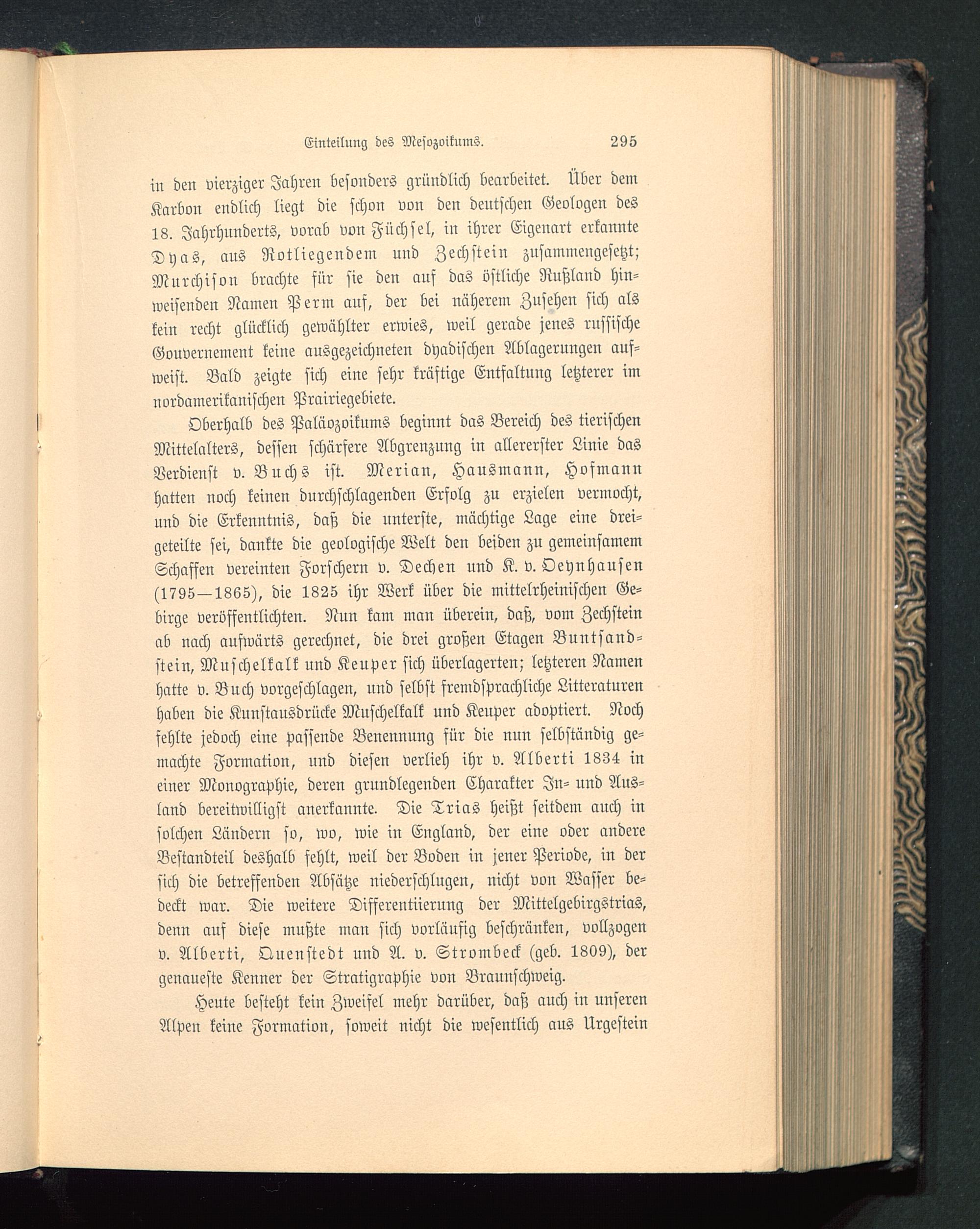 Oberhalb des Paläozoikums beginnt das Bereich des tierischenMittelalters, dessen schärfere Abgrenzung in allererster Linie dasVerdienst v. Buchs ist. Merian, Hausmann, Hofmannhatten noch keinen durchschlagenden Erfolg zu erzielen vermocht,und die Erkenntnis, daß die unterste, mächtige Lage eine drei-geteilte sei, dankte die geologische Welt den beiden zu gemeinsamemSchaffen vereinten Forschern v. Dechen und K. v. Oeynhausen(1795—1865), die 1825 ihr Werk über die mittelrheinischen Ge-birge veröffentlichten. Nun kam man überein, daß, vom Zechsteinab nach aufwärts gerechnet, die drei großen Etagen Buntsand-stein, Muschelkalk und Keuper sich überlagerten; letzteren Namenhatte v. Buch vorgeschlagen, und selbst fremdsprachliche Litteraturenhaben die Kunstausdrücke Muschelkalk und Keuper adoptiert. Nochfehlte jedoch eine paffende Benennung für die nun selbständig ge-machte Formation, und diesen verlieh ihr v. Alberti 1834 ineiner Monographie, deren grundlegenden Charakter In- und Aus-land bereitwilligst anerkannte. Die Trias heißt seitdem auch insolchen Ländern so, wo, wie in England , der eine oder andereBestandteil deshalb fehlt, weil der Boden in jener Periode, in dersich die betreffenden Absätze niederschlugen, nicht von Wasser be-deckt war. Die weitere Differenzierung der Mittelgebirgstrias,denn auf diese mußte man sich vorläufig beschränken, vollzogenv. Alberti, Quenstedt und A. v. Strombeck (geb. 1809), dergenaueste Kenner der Stratigraphie von Brauuschweig.