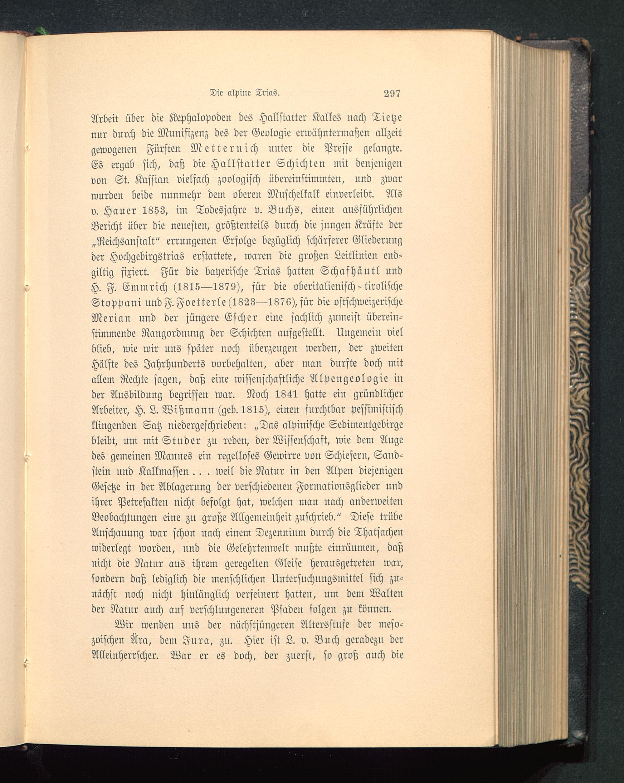 Arbeit über die Kephalopodcn des Hall statter Kalkes nach Tietzenur durch die Munifizenz des der Geologie erwähntermaßen allzeitgewogenen Fürsten Metternich unter die Presse gelangte.Es ergab sich, daß die Hallstatt er Schichten mit denjenigenvon St. Kassian vielfach zoologisch übereinstimmten, und zwarwurden beide nunmehr dem oberen Muschelkalk einverleibt. Alsv. Hauer 1853, im Todesjahre v. Buchs, einen ausführlichenBericht über die neuesten, größtenteils durch die jungen Kräste der„Neichsanstalt" errungenen Ersolge bezüglich schärferer Gliederungder Hochgebirgstrias erstattete, waren die großen Leitlinien end-giltig fixiert. Für die bayerische Trias hatten Schafhäutl undH. F. Emmrich (1815—1879), für die oberitalienisch-tirolischeStoppaui und F.Foetterle(1823—1876),für die ostschweizerischeMerian und der jüngere Escher eine sachlich zumeist überein-stimmeude Rangordnung der Schichten ausgestellt. Ungemein vielblieb, wie wir uns später noch überzeugen werden, der zweitenHälfte des Jahrhunderts vorbehalten, aber man durfte doch mitallem Rechte sagen, daß eine wissenschaftliche Alpengeologie inder Ausbildung begriffen war. Noch 1841 hatte ein gründlicherArbeiter, H. L. Wißmann (geb. 1815), einen furchtbar pessimistischklingenden Satz niedergeschrieben: „Das alpinische Sedimentgebirgebleibt, um mit Studer zu reden, der Wissenschaft, wie dem Augedes gemeinen Mannes ein regelloses Gewirre von Schiefern, Sand-stein nnd Kalkmafsen . . . weil die Natur in den Alpen diejenigenGesetze in der Ablagerung der verschiedenen Formationsglieder nndihrer Petrefakten nicht befolgt hat, welchen man nach anderweitenBeobachtungen eine zu große Allgemeinheit zuschrieb." Diese trübeAnschauung war schon nach einem Dezennium durch die Thatsachenwiderlegt worden, nnd die Gelehrtenwelt mußte einräumen, daßnicht die Natur aus ihrem geregelten Gleise heransgetreteu war,sondern daß lediglich die menschlichen Untersuchungsmittel sich zu-nächst noch nicht hinlänglich verfeinert hatten, um dem Waltender Natur auch auf verschlungeneren Pfaden folgen zu können.