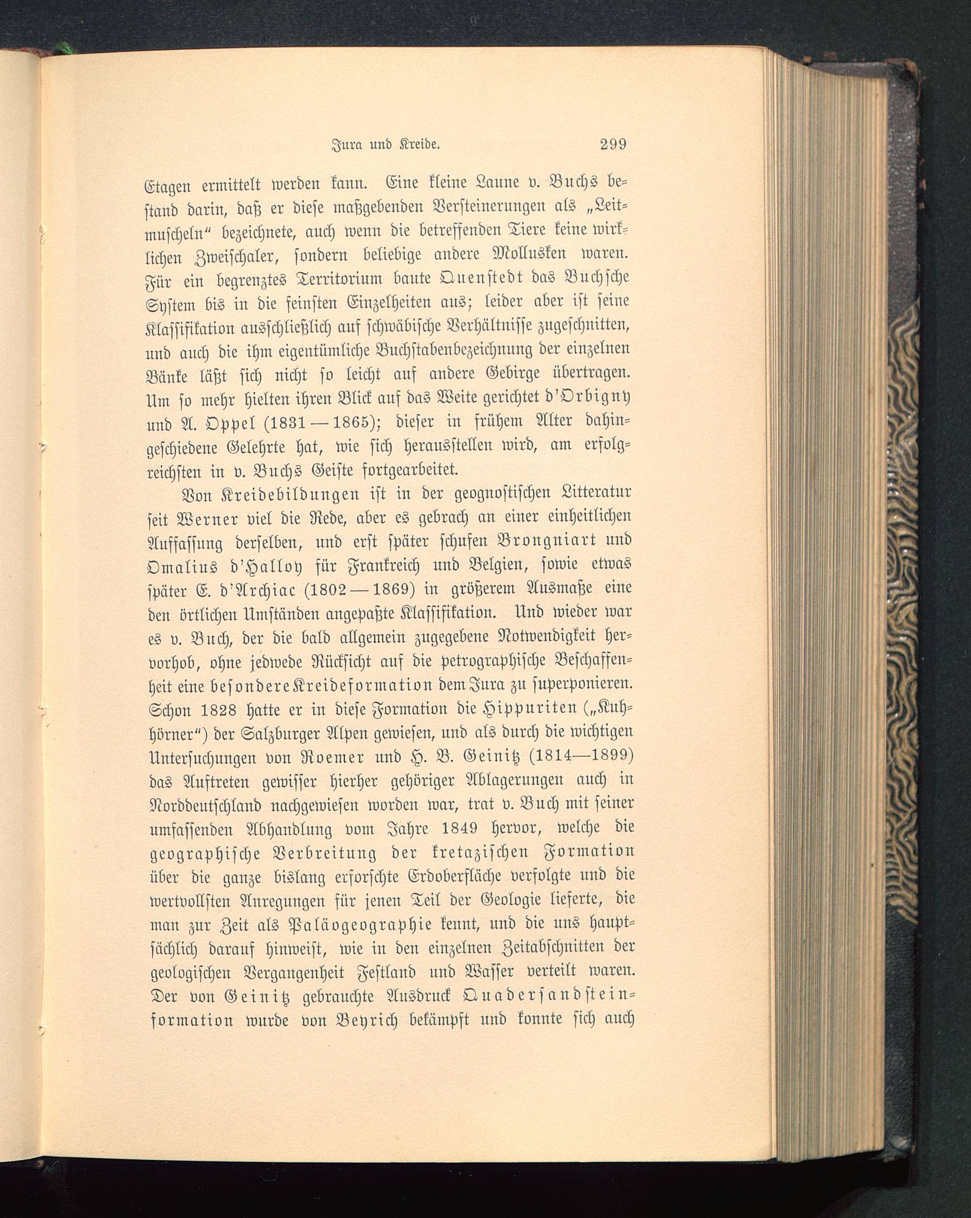 Etagen ermittelt werden kann. Eine kleine Laune v. Buchs be-stand darin, daß er diese maßgebenden Versteinerungen als „Leit-muscheln" bezeichnete, auch wenn die betreffenden Tiere keine wirk-lichen Zweischaler, sondern beliebige andere Mollusken waren.Für ein begrenztes Territorium baute Quenstedt das BuchscheSystem bis in die feinsten Einzelheiten aus; leider aber ist seineKlassifikation ausschließlich auf schwäbische Verhältnisse zugeschnitten,und anch die ihm eigentümliche Bnchstabenbczeichuung der einzelnenBänke läßt sich nicht so leicht ans andere Gebirge übertragen.Um so mehr hielten ihren Blick ans das Weite gerichtet d'Orbignyund A. Oppel (1831 — 1865); dieser in frühem Alter dahin-geschiedene Gelehrte hat, wie sich herausstellen wird, am erfolg-reichsten in v. Buchs Geiste fortgearbeitet.