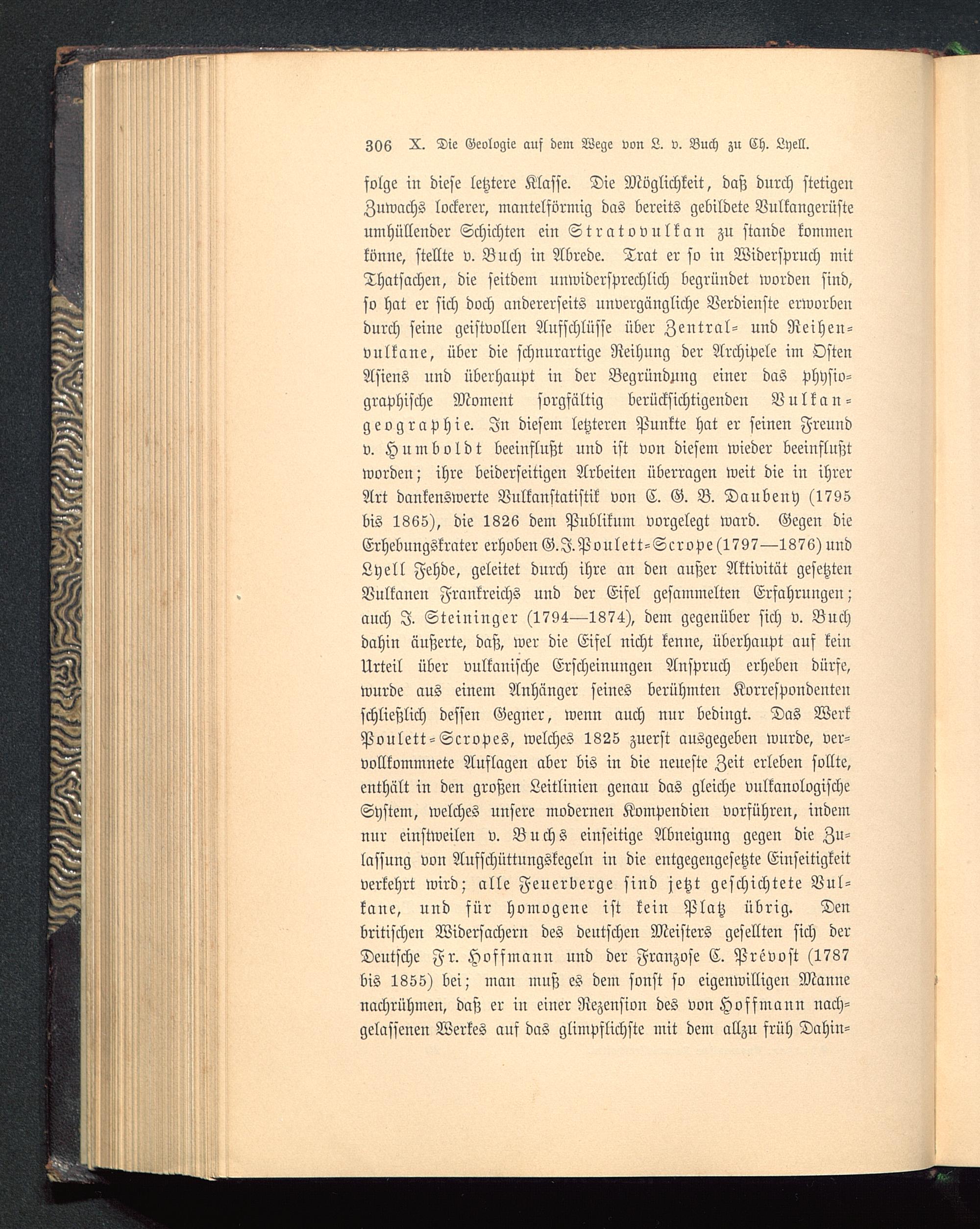 folge in diese letztere Klasse. Die Möglichkeit, daß durch stetigenZuwachs lockerer, mantelsörmig das bereits gebildete Vulkangerüsteumhüllender Schichten ein Strato Vulkan zu stände kommenkönne, stellte v. Buch in Abrede. Trat er so in Widerspruch mitThatsachen , die seitdem unwidersprechlich begründet worden sind,so hat er sich doch andererseits unvergängliche Verdienste erworbendurch seine geistvollen Aufschlüsse über Zentral- und Reihen-vulkane, über die schnurartige Reihung der Archipele im OstenAsiens und überhaupt in der Begründung einer das Phhsio-graphische Moment sorgfältig berücksichtigenden Vulkan -geographie. In diesem letzteren Punkte hat er seinen Freundv. Humboldt beeinflußt und ist von diesem wieder beeinflußtworden; ihre beiderseitigen Arbeiten überragen weit die in ihrerArt dankenswerte Vulkanstatistik von C. G. B. Daubeny (1795bis 1865), die 1826 dem Pnbliknm vorgelegt ward. Gegen dieErhebungskratcr erhobenG. I. Poulett - Scrope (17 9 7—18 7 6) undLyell Fehde, geleitet durch ihre an den außer Aktivität gesetztenVulkanen Frankreichs und der Eifel gesammelten Erfahrungen;auch I. Steininger (1794—1874), dem gegenüber sich v. Buchdahin äußerte, daß, wer die Eifel nicht kenne, überhaupt auf keiuUrteil über vulkanische Erscheinungen Anspruch erheben dürfe,wurde aus einem Anhänger seines berühmten Korrespondentenschließlich dessen Gegner, wenn auch nur bedingt. Das WerkPoulett-Scropes, welches 1825 zuerst ausgegeben wurde, ver-vollkommnete Auflagen aber bis in die neueste Zeit erleben sollte,enthält in den großen Leitlinien genau das gleiche vulkanologischeSystem, welches unsere modernen Kompendien vorführen, indemnur einstweilen v. Buchs einseitige Abneigung gegen die Zu-lassung von Aufschüttungskegeln in die entgegengesetzte Einseitigkeitverkehrt wird; alle Feuerberge sind jetzt geschichtete Vul-kane, und sür homogene ist kein Platz übrig. Denbritischen Widersachern des deutschen Meisters gesellten sich derDeutsche Fr. Hoffmann und der Franzose C. Prevost (1787bis 1855) bei; man muß es dem sonst so eigenwilligen Mannenachrühmen, daß er in einer Rezension des von Hoffmann nach-gelassenen Werkes auf das glimpflichste mit dem allzu früh Dahin-