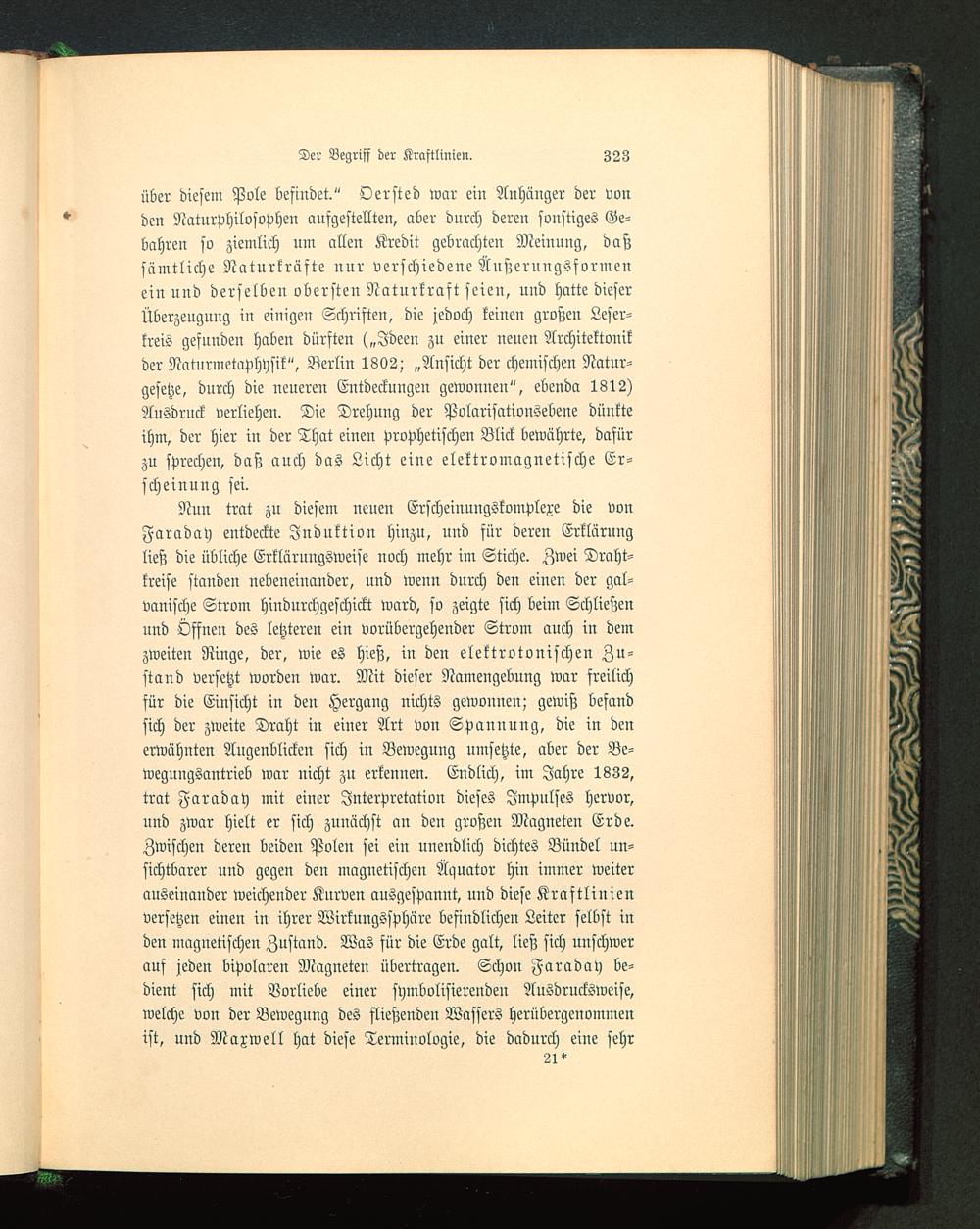 über diesem Pole befindet." Oersted war ein Anhänger der vonden Naturphilosophen aufgestellten, aber dnrch deren sonstiges Ge-bahren so ziemlich nm allen Kredit gebrachten Meinung, daßsämtliche Naturkräfte nur verschiedene Äußeruugsformenein und derselben obersten Naturkraft seien, und hatte dieserÜberzeugung in einigen Schriften, die jedoch keinen großen Leser-kreis gefunden haben dürften („Ideen zu einer neuen Architektonikder Naturmctaphysik", Berlin 1802; „Ansicht der chemischen Natur-gesetze, durch die neueren Entdeckungen gewonnen", ebenda 1812)Ausdruck verliehen. Die Drehung der Polarisationsebene dünkteihm, der hier in der That einen prophetischen Blick bewährte, dafürzu sprechen, daß auch das Licht eine elektromagnetische Er-scheinung sei.