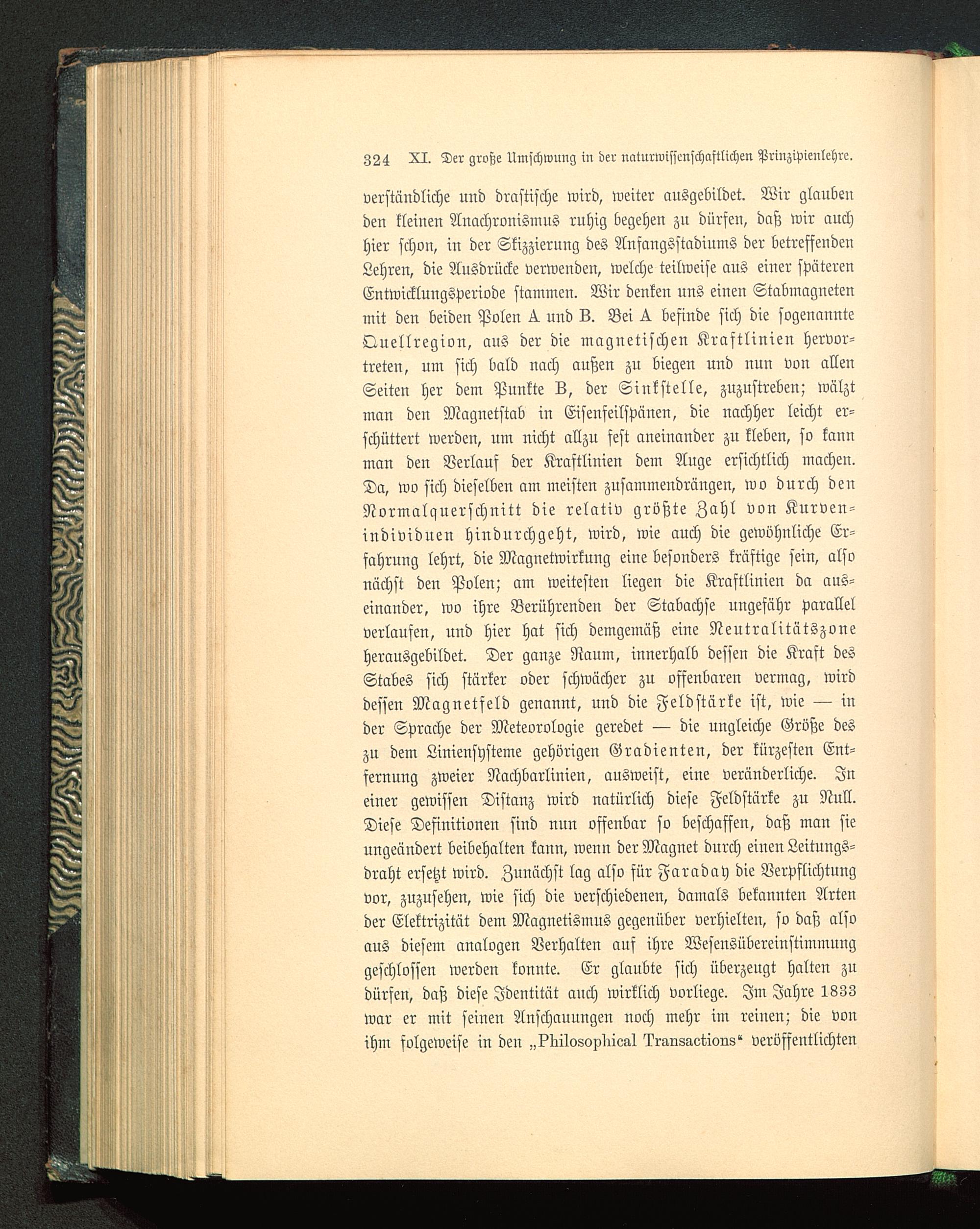 verständliche und drastische wird, weiter ausgebildet. Wir glaubeuden kleinen Anachronismus ruhig begehen zu dürfen, daß wir auchhier schon, in der Skizzierung des AnfangSstadinms der betreffendenLehren, die Ausdrücke verwenden, welche teilweise aus einer späterenEntwicklungsperiode stammen. Wir denken uns einen Stabmagnetenmit den beiden Polen ^ und L. Bei ^ befinde sich die sogenannteQuellregion, aus der die magnetischen Kraftlinien hervor-treten, um sich bald nach außen zu biegen und nun von allenSeiten her dem Punkte L, der Sinkstelle, zuzustreben; wälztman den Magnetstab in Eisenfeilspänen, die nachher leicht er-schüttert werden, um nicht allzu fest aneinander zu kleben, so kannman den Verlauf der Kraftlinien dem Ange ersichtlich machen.Da, wo sich dieselben am meisten zusammendrängen, wo durch denNormalquerschnitt die relativ größte Zahl von Knrven-individnen hindurchgeht, wird, wie auch die gewöhnliche Er-fahrung lehrt, die Magnetwirknng eine besonders kräftige sein, alsonächst den Polen; am weitesten liegen die Kraftlinien da aus-einander, wo ihre Berührenden der Stabachse ungefähr parallelverlaufen, und hier hat sich demgemäß eine Neutralitätszoneherausgebildet. Der ganze Raum, innerhalb dessen die Kraft desStabes sich stärker oder schwächer zu offenbaren vermag, wirddessen Magnetfeld genannt, und die Feldstärke ist, wie — inder Sprache der Meteorologie geredet — die ungleiche Größe deszu dem Linienshsteme gehörigen Gradienten, der kürzesten Ent-fernung zweier Nachbarlinien, ausweist, eiue veränderliche. Ineiner gewissen Distanz wird natürlich diese Feldstärke zu Null.Diese Definitionen sind nun offenbar so beschaffen, daß man sieungeändert beibehalten kann, wenn der Magnet durch einen Leitungs-draht ersetzt wird. Zunächst lag also für Faraday die Verpflichtungvor, zuzusehen, wie sich die verschiedenen, damals bekannten Artender Elektrizität dem Magnetismus gegenüber verhielten, so daß alsoaus diesem analogen Verhalten auf ihre Wesensübereinstimmuuggeschlossen werden konnte. Er glaubte sich überzeugt halten zudürfen, daß diese Identität auch wirklich vorliege. Im Jahre 1833war er mit seinen Anschauungen noch mehr im reinen; die vonihm folgeweise in den „^liilosopiiioal?rkriMet,iori8« veröffentlichten