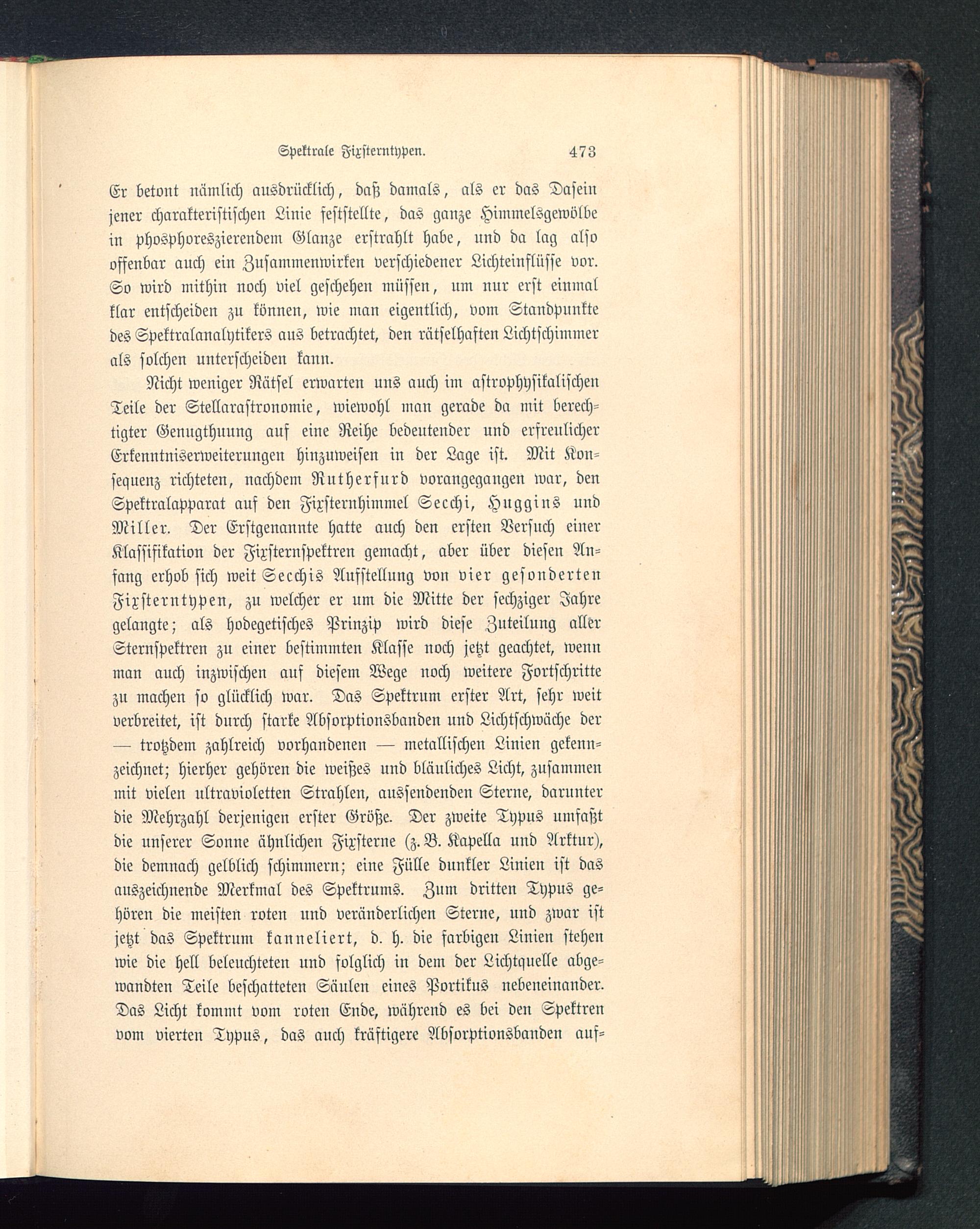 Nicht weniger Rätsel erwarten uus auch im astrophysikalischeuTeile der Stellarastrouomie, wiewohl man gerade da mit berech-tigter Genugthuung auf eine Reihe bedeutender und erfreulicherErkenntniserweiterungen hinzuweisen in der Lage ist. Mit Kon-sequenz richteten, nachdem Rntherfurd vorangegangen war, denSpektralapparat auf den Fixsternhimmel Secchi, Huggins undMiller. Der Erstgenannte hatte auch den ersten Versuch eiuerKlassifikation der Fixsternspektren gemacht, aber über diesen An-fang erhob sich weit Secchis Ausstellung vvn vier gesondertenFixsterntypen, zu welcher er um die Mitte der sechziger Jahregelangte; als hodegetisches Prinzip wird diese Zuteilung allerSternspektren zu einer bestimmten Klasse noch jetzt geachtet, wennman auch inzwischen auf diesem Wege uoch weitere Fortschrittezu machen so glücklich war. Das Spektrum erster Art, sehr weitverbreitet, ist durch starke Absorptionsbanden und Lichtschwüche der— trotzdem zahlreich vorhaudeneu — metallischen Linien gekenn-zeichnet; hierher gehören die weißes und bläuliches Licht, zusammenmit vielen ultravioletten Strahlen, aussendenden Sterne, darunterdie Mehrzahl derjenigen erster Größe. Der zweite Typus umfaßtdie unserer Sonne ähnlichen Fixsterne (z. B. Kapella und Arktnr),die demnach gelblich schimmern; eine Fülle dunkler Linien ist dasauszeichnende Merkmal des Spektrums. Zum dritten Typus ge-hören die meisten roten und veränderlichen Sterne, und zwar istjetzt das Spektrum kanneliert, d. h. die farbigen Linien stehenwie die hell beleuchteten und folglich in dem der Lichtquelle abge-wandten Teile beschatteten Säulen eines Portikus nebeneinander.Das Licht kommt vom roten Ende, während es bei den Spektrenvom vierten Typus, das auch kräftigere Absorptionsbanden auf-