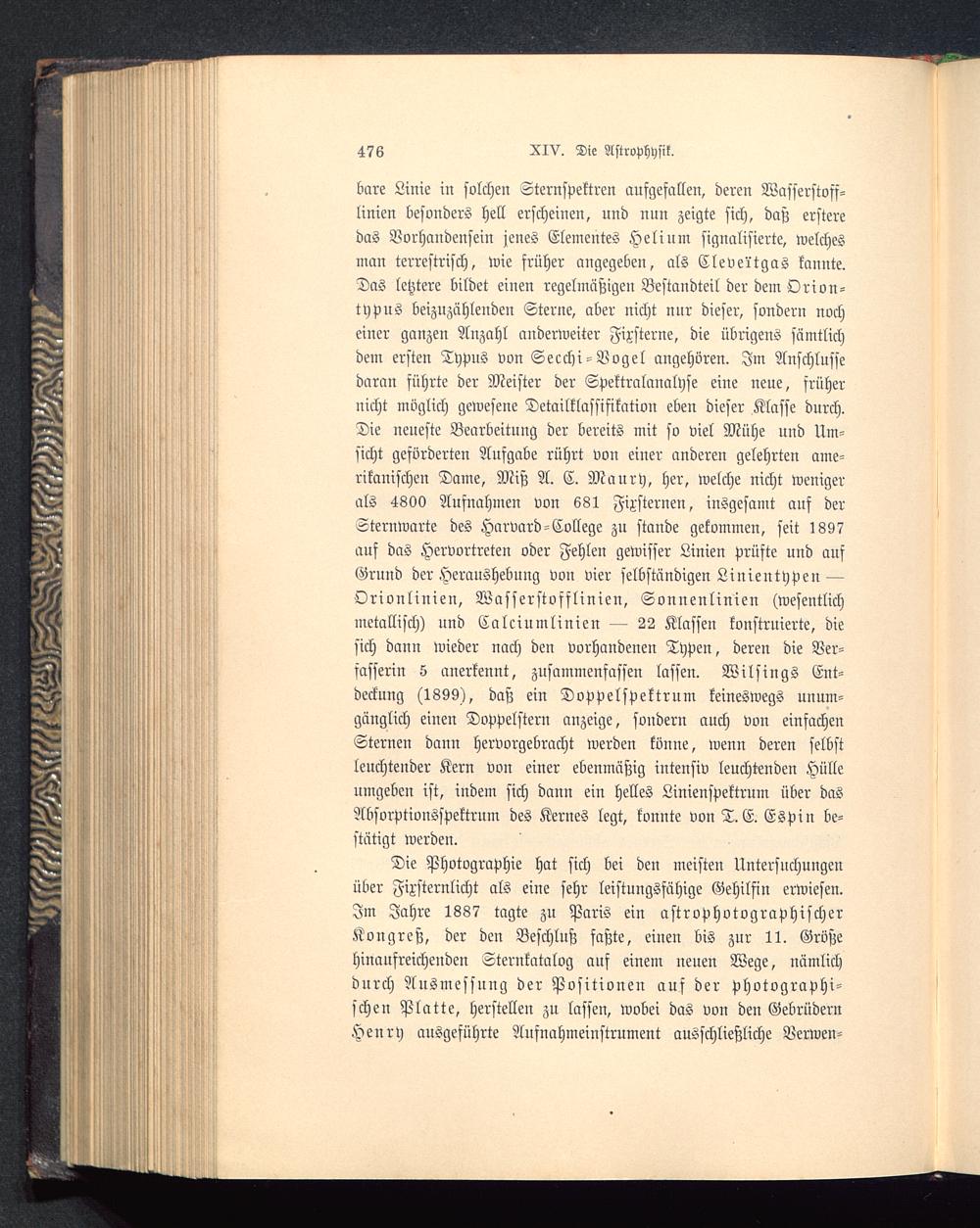 bare Linie in solchen Sternspektren aufgefallen, deren Wasserstoff-linien besonders hell erscheinen, und nun zeigte sich, daß ersteredas Vorhandensein jenes Elementes Helium signalisierte, welchesman terrestrisch, wie früher angegeben, als Clevei'tgas kannte.Das letztere bildet einen regelmäßigen Bestandteil der dem Orion-typus beizuzühleudeu Sterne, aber nicht nur dieser, sondern nocheiner ganzen Anzahl anderweiter Fixsterne, die übrigens sämtlichdem ersten Typns von Secchi-Vogel angehören. Im Anschlüssedaran führte der Meister der Spektralanalyse eine neue, frühernicht möglich gewesene Detailklassisikation eben dieser Klasse durch.Die neueste Bearbeitung der bereits mit so viel Mühe und Um-sicht geförderten Aufgabe rührt von einer anderen gelehrten ame-rikanischen Dame, Miß A. C. Maury, her, welche nicht wenigerals 4800 Ausnahmen von 681 Fixsternen, insgesamt auf derSternwarte des Harvard-College zu stände gekommen, seit 1897auf das Hervortreten oder Fehlen gewisser Linien Prüfte und aufGrund der Heraushebung von vier selbständigen Linientypen —Orionlinieu, Wasserstofflinien, Sonnenlinien (wesentlichmetallisch) nnd Calciumlinien — 22 Klassen konstruierte, diesich dann wieder nach den vorhandenen Typen, deren die Ver-fasserin 5 anerkennt, zusammenfassen lassen. Wilsings Ent-deckung (1899), daß ein Doppelspektrum keineswegs unum-gänglich einen Doppelstern anzeige, sondern auch von einfachenSternen dann hervorgebracht werden könne, wenn deren selbstleuchtender Kern von einer ebenmäßig intensiv leuchtenden Hülleumgeben ist, indem sich dann ein Helles Linienspektrum über dasAbsorptionsspektrum des Kernes legt, konnte von T. E. Espin be-stätigt werden.