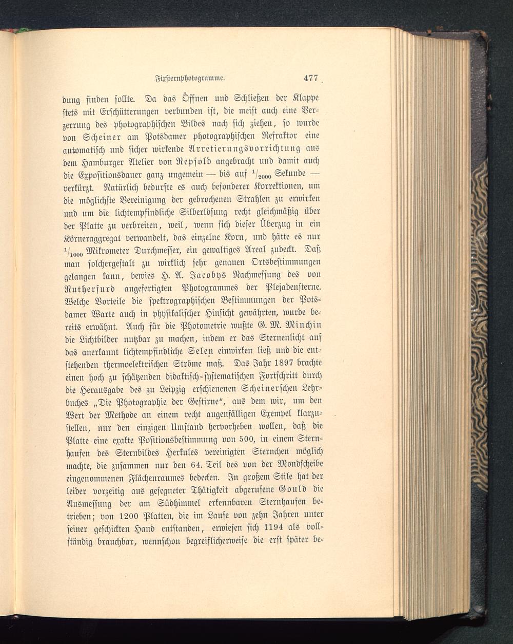 dung finden sollte. Da das Öffnen und Schließen der Klappestets mit Erschütterungen verbunden ist, die meist auch eine Ver-zerrung des photographischen Bildes nach sich ziehen, so wnrdevon Scheiner am Potsdamer photographischen Refraktor eineautomatisch und sicher wirkende Arretiernngsvorrichtuug ausdem Hamburger Atelier von Repsold angebracht und damit auchdie Expositionsdauer ganz ungemein — bis auf ^ggg Sekuude —verkürzt. Natürlich bedürfte es auch besonderer Korrektionen, umdie möglichste Vereinigung der gebrochenen Strahlen zu erwirkenund um die lichtempfindliche Silberlösuug recht gleichmäßig überder Platte zu verbreiten, weil, wenn sich dieser Überzug in einKörneraggregat verwandelt, das einzelne Korn, uud hätte es nur^/looo Mikrometer Durchmesser, ein gewaltiges Areal zudeckt. Daßmau solchergestalt zu wirklich sehr genauen Ortsbestimmungengelangen kann, bewies H. A. Jacobys Nachmessung des vouRuthersurd angefertigten Photogrammes der Plejadensterne.Welche Vorteile die spektrographischeu Bestimmungen der Pots-damer Warte auch in physikalischer Hinsicht gewährten, wurde be-reits erwähnt. Auch für die Photometrie wußte G. M. Minchiudie Lichtbilder nutzbar zu machen, indem er das Sternenlicht aufdas anerkannt lichtempfindliche Selen einwirken ließ und die ent-stehenden thermoelektrischen Strome maß. Das Jahr 1897 brachteeinen hoch zu schätzenden didaktisch-systematischen Fortschritt dnrchdie Herausgabe des zu Leipzig erschienenen Schein er scheu Lehr-buches „Die Photographie der Gestirne", aus dem wir, um denWert der Methode an einem recht augenfälligen Exempel klarzu-stellen, nur den einzigen Umstand hervorheben wollen, daß diePlatte eine exakte Positionsbestimmung von 500, in einem Stern-haufen des Sternbildes Herkules vereinigten Sternchen möglichmachte, die zusammen nur den 64. Teil des von der Mondscheibeeingenommenen Flächenraumes bedecken. In großem Stile hat derleider vorzeitig aus gesegneter Thätigkeit abgerufene Gould dieAusmessung der am Südhimmel erkennbaren Sternhaufen be-trieben; von 1200 Platten, die im Laufe von zehn Jahren unterseiner geschickten Hand entstanden, erwiesen sich 1194 als voll-ständig brauchbar, wennschou begreiflicherweise die erst später be-