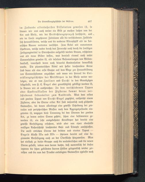 im Zustande alleräußerster Dissolutiou gewesen ist, sokönnen wir uns auch weiter ein Bild zu machen suchen von derArt und Weise, wie der Verdichtungsprozeß fortschritt, undwie im Laufe ungeheurer Zeiträume alle die verschiedenen Zuständesich herausbildeten, welche uns die moderne Astrophysik als im kos-mischen Ranme vertreten vorführt. Jene Nebel mit monotonen:Spektrum, welche weder durch das Fernrohr noch durch die sonstigenZerlegungsmittel in Sternhaufen aufgelöst werden können, erscheinenuns als treue Bilder dessen, was dereinst einmal auch unserSonnensystem gewesen ist, als insulare Ansammlungen von Welten-baustoff, innerhalb deren noch keinerlei Kondensation bemerklichwurde. Die planetarischen Nebel mit Heller leuchtendem Kernesind dann als eine erste Etappe auf dem Wege zur Herausbildungvon Sonnensystemen anzusehen uud wenn wir hierauf die Ent-wicklungsgeschichte der Weltkörper in der Weise weiter ver-folgen, wie es von Zo ellner und Secchi in den Grundzügenfestgestellt, von H. C. Vogel aber grundsätzlich gebilligt worden ist,so können wir es aussprechen: In den verschiedenen Typenoder Spektralklassen der Fixsterne kommt deren ver-schiedenes Lebensalter zum Ausdrucke. Was dem erstenund zweiten Typus von Secchi-Bogel zugehört, entspricht einemFixsterne, aber die Sterne erster Art sind wesentlich noch glühendeGasmassen, bei denen allerdings eine gewisse Scheidung der zen-tralen und peripherischen Massen nach dem Aggregatznstande ein-getreten ist, wogegen diese Trennung bei den Sternen der zweitenArt, zu denen unsere Sonne gehört, schon eine bestimmtere ge-worden ist; ein sehr ausgedehnter Kernkörper hat bereits einegewisse Verfestigung erfahren, wird aber von einer ebenfallsmassigen Außenschicht leuchtender Gase und Dämpft umschlossen.Die meist rötlichen Sterne des dritten und vierten Typus —Vogels Klasse III s, und III v — scheinen bereits ans eine be-ginnende Verfestigung auch au der Oberfläche hinzuweisen. Manhat vielfach zu dieser Gruppe auch die veränderlichen und die neuenSterne gestellt, indem man daran dachte, daß namentlich bei diesenletzteren die schon gebildeten starren Hüllen gelegentlich wieder zer-reißen und die nun des Druckes entledigten Gasmassen explosiv nach