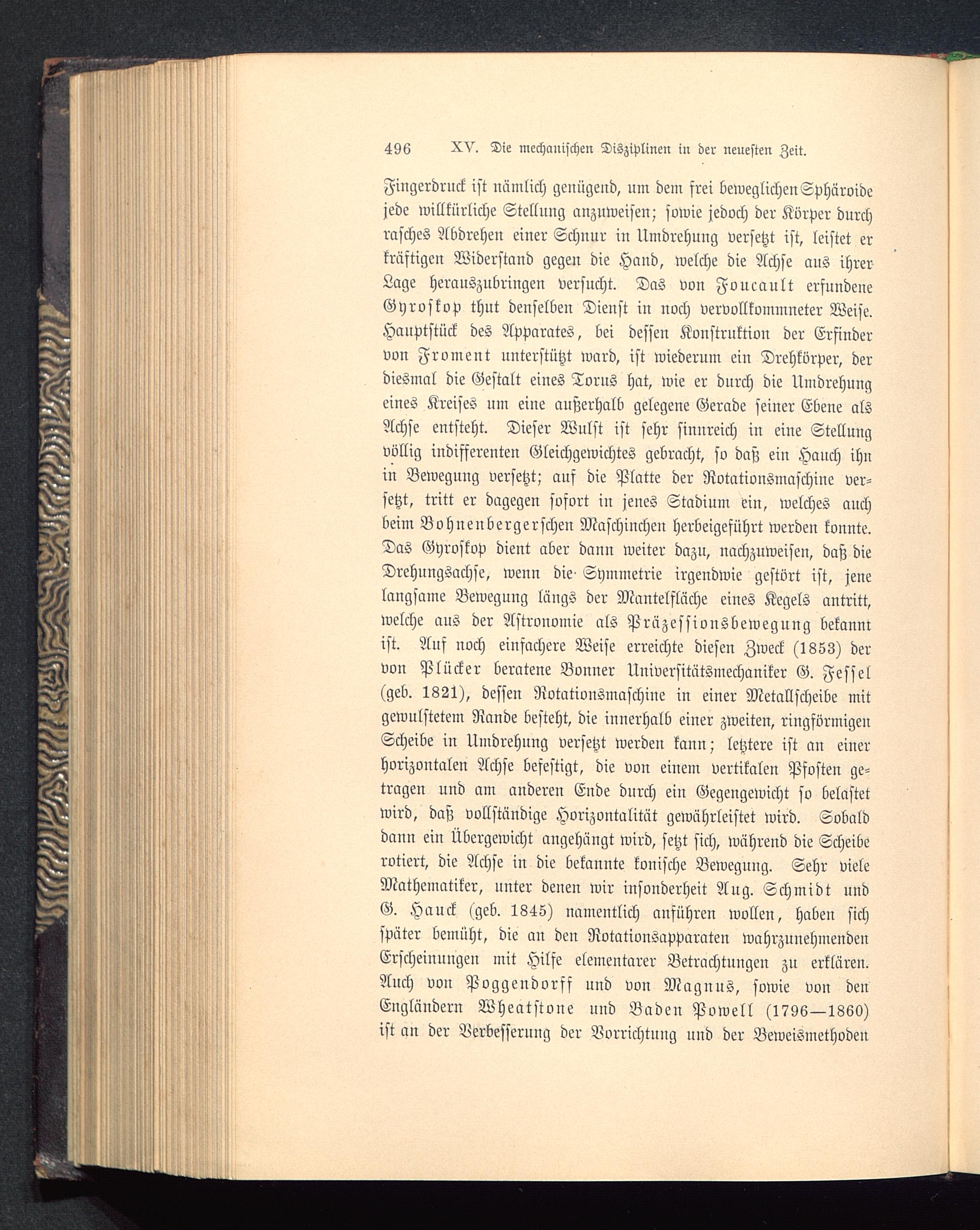 Fingerdruck ist nämlich genügend, um dem frei beweglichenSphäroidejede willkürliche Stellung anzuweisen; sowie jedoch der Korper durchrasches Abdrehen einer Schnur iu Umdrehung versetzt ist, leistet erkräftigen Widerstand gegen die Hand, welche die Achse aus ihrerLage herauszubringen versucht. Das von Foucault erfundeneGyroskop thut denselben Dienst in noch vervollkommneter Weise.Hauptstück des Apparates, bei dessen Konstruktion der Erfindervon Froment unterstützt ward, ist wiederum ein Drehkörper, derdiesmal die Gestalt eines Torns hat, wie er durch die Umdrehungeines Kreises um eine außerhalb gelegene Gerade seiner Ebene alsAchse entsteht. Dieser Wulst ist sehr sinureich in eine Stellungvöllig indifferenten Gleichgewichtes gebracht, so daß ein Hanch ihnin Bewegung versetzt; auf die Platte der Rotationsmaschine ver-setzt, tritt er dagegen sofort in jenes Stadium ein, welches auchbeim Bohneubergerschen Maschinchen herbeigeführt werden konnte.Das Gyroskop dient aber dann weiter dazu, nachzuweisen, daß dieDrehungsachse, wenn die« Symmetrie irgendwie gestört ist, jenelangsame Bewegung längs der Mantelfläche eines Kegels antritt,welche ans der Astronomie als Präzessionsbewegung bekanntist. Ans noch einfachere Weise erreichte diesen Zweck (1853) dervon Plücker beratene Bonner Universitätsmechaniker G. Fessel(geb. 1821), dessen Rotationsmaschine in einer Metallscheibe mitgewulstetem Rande besteht, die innerhalb einer zweiten, ringförmigenScheibe in Umdrehung versetzt werden kann; letztere ist an einerhorizontalen Achse befestigt, die von einem vertikalen Pfosten ge-tragen und am anderen Ende durch ein Gegengewicht so belastetwird, daß vollständige Horizontalität gewährleistet wird. Sobalddann ein Übergewicht angehängt wird, setzt sich, während die Scheiberotiert, die Achse in die bekannte konische Bewegung. Sehr vieleMathematiker, unter denen wir insonderheit Aug. Schmidt undG. Hauck (geb. 1845) namentlich anführen wollen, haben sichspäter bemüht, die an den Rotationsapparaten wahrzunehmendenErscheinuugeu mit Hilfe elementarer Betrachtungen zu erklären.Auch von Poggendorff und von Magnus, sowie von denEngländern Wheatstoue und Baden Powell (1796—1860)ist an der Verbesserung der Vorrichtung und der Beweismethoden