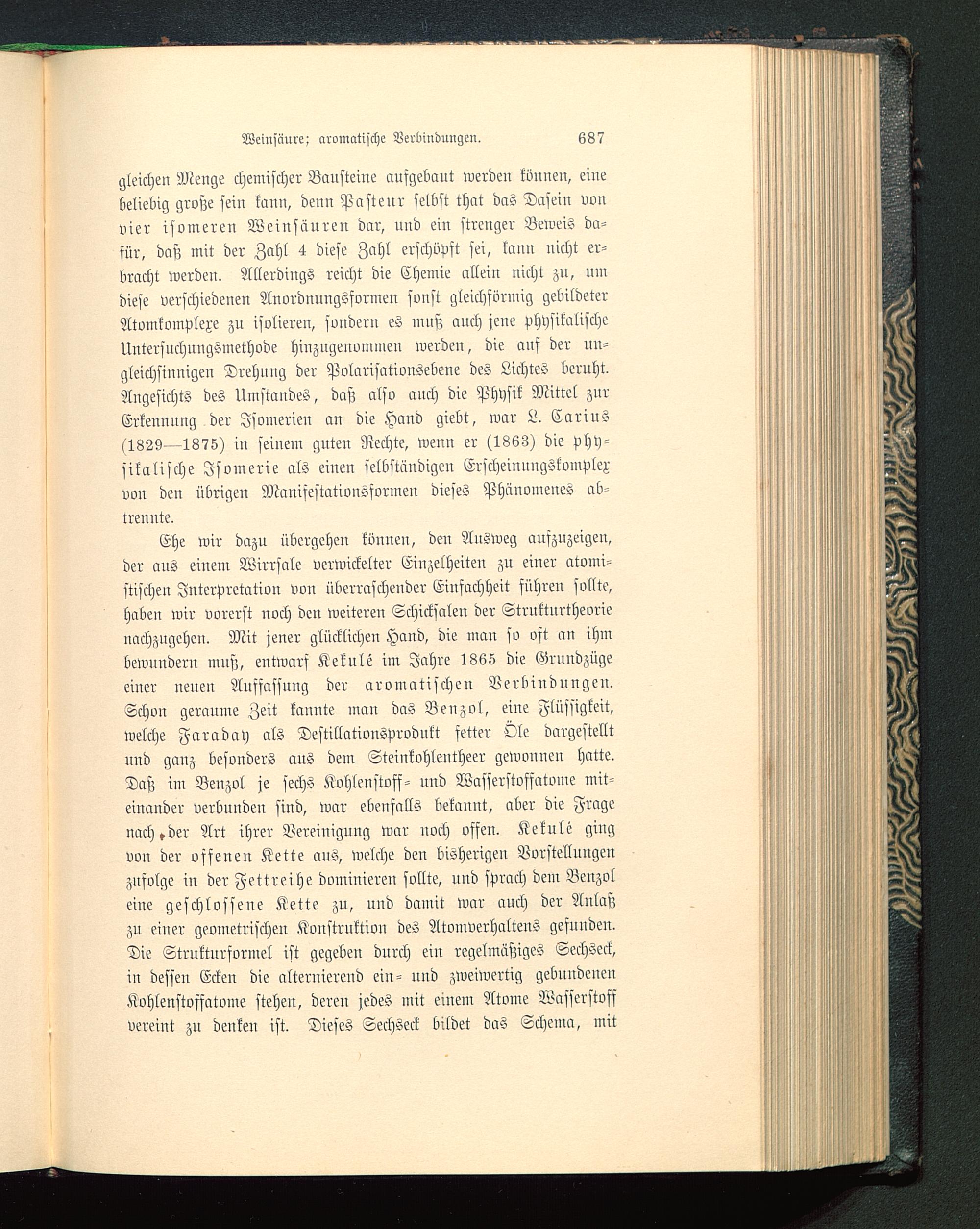 gleichen Menge chemischer Bausteine aufgebaut werden können, einebeliebig große sein kann, denn Pastenr selbst that das Dasein vonvier isomeren Weinsäuren dar, und ein strenger Beweis da-für, daß mit der Zahl 4 diese Zahl erschöpft sei, kauu uicht er-bracht werden. Allerdings reicht die Chemie allein nicht zu, umdiese verschiedenen Anordnungsformen sonst gleichförmig gebildeterAtomkomplexe zu isolieren, sondern es muß auch jcue physikalischeUntersuchuugsmethode hiuzugenommen werden, die ans der nn-gleichsinnigen Drehung der Polarisationsebene des Lichtes beruht.Angesichts des Umstandes, daß also auch die Physik Mittel zurErkennung der Jsomerien an die Hand giebt, war L. Carius(1829—1875) iu seinem guten Rechte, wenn er (1863) die phy-sikalische Jsomerie als einen selbständigen Erscheinungskomplexvon den übrigen Manifestatioussormeu dieses Phänoinenes ab-trennte.