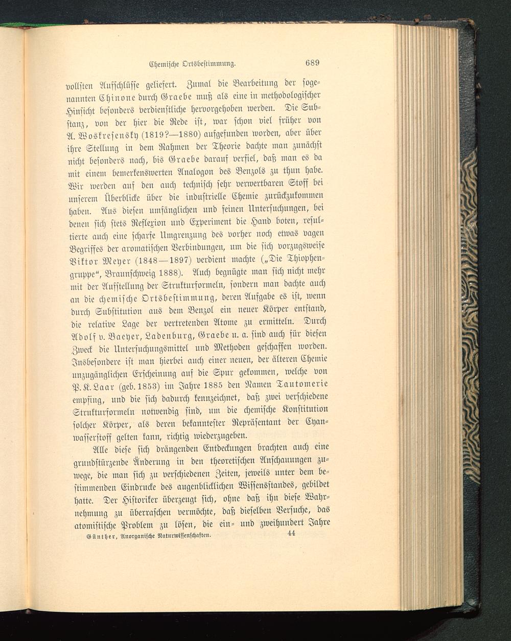 vollsten Aufschlüsse geliefert. Zumal die Bearbeitung der soge-nannten Chinone durch Graebe muß als eine in methodologischerHinsicht besonders verdienstliche hervorgehoben werden. Die Sub-stanz, von der hier die Rede ist, war schon viel früher vonA. Woskresensky (1819?—1880) aufgefunden worden, aber überihre Stellung in dem Rahmen der Theorie dachte man zunächstnicht besonders nach, bis Graebe darauf verfiel, daß man es damit einem bemerkenswerten Analogon des Benzols zu thun habe.Wir werden auf den auch technisch sehr verwertbaren Stoff beinnserem Überblicke über die industrielle Chemie zurückzukommenhaben. Aus diesen umfänglichen und feinen Untersuchungen, beidenen sich stets Reflexion und Experiment die Hand boten, resul-tierte auch eine scharfe Umgrenzung des vorher uoch etwas vagenBegriffes der aromatischen Verbiudungeu, um die sich vorzugsweiseViktor Meyer (1848 — 1897) verdient machte („Die Thiophen-gruvpe", Braunschweig 1888). Auch begnügte man sich nicht mehrmit der Aufstellung der Strukturformeln, sondern man dachte auchan die chemische Ortsbestimmung, deren Aufgabe es ist, wenndurch Substitution aus dem Benzol ein neuer Körper entstand,die relative Lage der vertretenden Atome zu ermitteln. DurchAdolf v. Baeyer, Ladenbnrg, Graebe n. a. sind auch für diesenZweck die Untersuchnngsmittel und Methoden geschaffen worden.Insbesondere ist man hierbei auch einer neuen, der älteren Chemieunzngänglichen Erscheinung auf die Spur gekommen, welche vonP.K.Laar (geb. 1853) im Jahre 1885 den Namen Tautomerieempfing, und die sich dadurch kennzeichnet, daß zwei verschiedeneStrukturformeln notwendig sind, um die chemische Konstitutionsolcher Körper, als deren bekanntester Repräsentant der Cyan-wasserstoff gelten kann, richtig wiederzugeben.