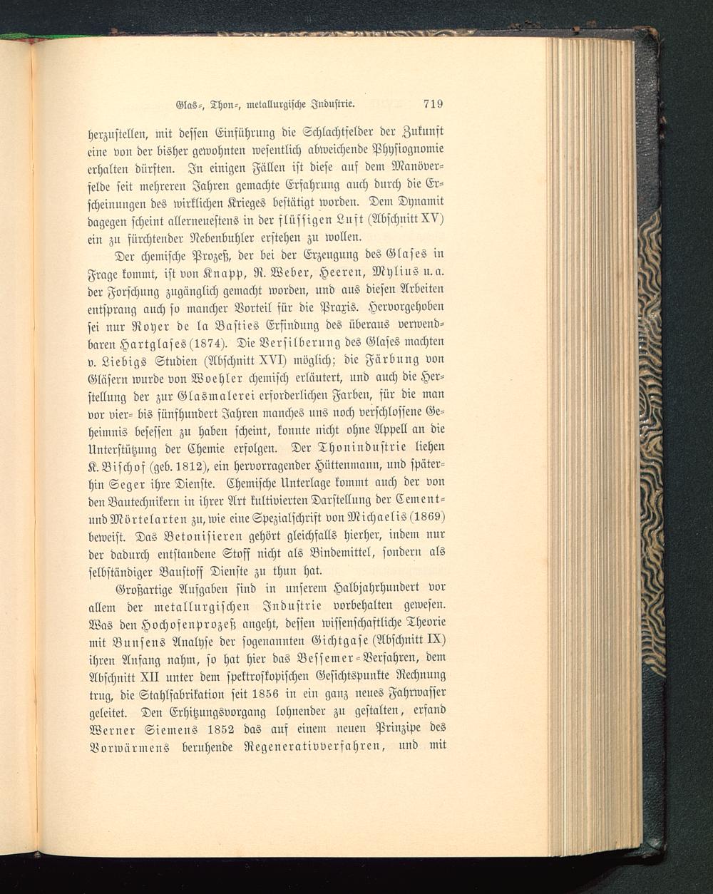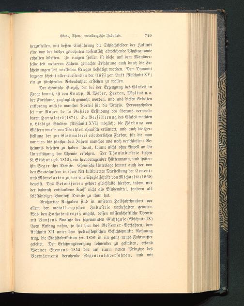 Großartige Aufgaben sind in unserem Halbjahrhuudert vorallem der metallurgischen Industrie vorbehalten gewesen.Was den Hochofenprozeß angeht, dessen wissenschaftliche Theoriemit Bunsens Analyse der sogenannten Gichtgase (Abschnitt IX)ihren Anfang nahm, fo hat hier das Bessemer-Verfahren, demAbschnitt XII unter dem spektrvskopischen Gesichtspunkte Rechnungtrug, die Stahlsabrikation seit 1856 in ein ganz neues Fahrwassergeleitet. Den Erhitzungsvorgang lohnender zu gestalten, erfandWerner Siemens 1852 das auf einem neuen Prinzipe desVorwärmens beruhende Regenerativverfahren, und mit
