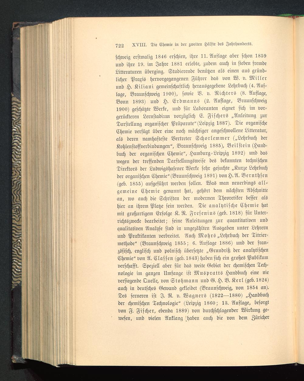 schweig erstmalig 1846 erschien, ihre 11. Auflage aber schon 1859und ihre 19. im Jahre 1881 erlebte, zudem auch in sieben fremdeLitteraturen überging. Studierende benutzen als einen aus grüud-licher Praxis hervorgegangeuen Führer das von W. v. Millerund H. Kiliani gemeinschaftlich herausgegebene Lehrbuch (4. Auf-lage, Braunschweig 1900), sowie V. v. Richters (8. Auflage,Bonn 1893) uud H. ErdmannS (2. Auflage, Braunschweig 1900) geschätzte Werke, uud für Laboranten eignet sich im vor-gerückteren Lernstadium vorzüglich E. Fischers „Anleitung zurDarstellung organischer Präparate" (Leipzig 1887). Die organischeChemie verfügt über eine noch mächtiger angeschwollene Litteratur,als deren namhafteste Vertreter Schorlemmer („Lehrbuch derKohlenstoffverbindungen", Braunschweig 1885), Beilstein (Hand-buch der organischen Chemie", Hamburg-Leipzig 1892) und daswegen der treffenden Darstellungsweise des bekannten technischenDirektors der Ludwigshaseuer Werke sehr gesuchte „Kurze Lehrbuchder organischen Chemie" (Braunschweig 1891) von H. A. Bernthsen(geb. 1855) aufgeführt werden sollen. Was man neuerdings all-gemeine Chemie genannt hat, gehört dem nächsten Abschnittean, wo auch die Schriften der modernen Theoretiker besser alshier an ihrem Platze sein werden. Die analytische Chemie hatmit großartigem Erfolge K. R. Fresenius (geb. 1818) für Unter-richtszwecke bearbeitet; seine Anleitungen zur quantitativen undqualitativen Analyse sind in ungezählten Ausgaben unter Lehrernund Praktikanten verbreitet. Auch Mohrs „Lehrbuch der Titrier-methode" (Braunschweig 1855; 6. Auflage 1886) und der fran-zösisch, englisch und polnisch übersetzte „Grundriß der analytischenChemie" von A. Classen (geb. 1843) haben sich ein großes Publikumverschafft. Speziell aber für das weite Gebiet der chemischen Tech-nologie im ganzen Umfange ist Muspratts Handbuch eine nieversiegende Quelle, von Stohmann und G. H. B. Kerl (geb. 1824)auch in deutsches Gewand gekleidet (Braunschweig , von 1854 an).Des ferneren ist I. R. v. Wagners (1822—1880) „Handbuchder chemischen Technologie" (Leipzig 1860; 13. Auflage, besorgtvon F. Fischer, ebenda 1889) von durchschlagender Wirkung ge-wesen, und vielen Anklang Haben anch die von dem Züricher