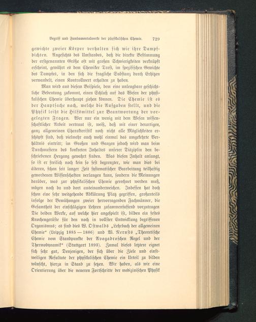Mau wird aus diesem Beispiele, dem eine unleugbare geschicht-liche Bedeutung zukommt, einen Schluß auf das Wesen der Physi-kalischen Chemie überhaupt ziehen können. Die Chemie ist esder Hauptsache uach, welche die Aufgaben stellt, und diePhysik leiht die Hilfsmittel zur Beantwortung der vor-gelegten Fragen. Wer nur ein wenig mit dem Wesen wissen-schaftlicher Arbeit vertraut ist, weiß, daß mit einer derartigen,ganz allgemeinen Charakteristik noch nicht alle Möglichkeiten er-schöpft sind, daß vielmehr auch Wohl einmal das umgekehrte Ver-hältnis eintritt; im Großen und Ganzen jedoch wird man beimDurchmustern des konkreten Inhaltes unserer Disziplin den be-schriebeneu Hergang gewahrt finden. Was diesen Inhalt anlangt,so ist er sreilich noch kein so fest begrenzter, wie man dies beiälteren, schon seit langer Zeit systematischer Bearbeitung teilhaftiggewordeneu Wissenschaften verlangen kann, sondern die Meinungendarüber, was zur physikalischen Chemie gerechnet werden muß,mögen uoch da und dort auseinanderweichen. Indessen hat dochschon eine sehr weitgehende Abklärung Platz gegriffen, großenteilsinfolge der Bemühungen zweier hervorragenden Fachmänner, dieGesamtheit der einschlägigen Lehren zusammeusassend vorzutragenDie beiden Werke, ans welche hier angespielt ist, bilden ein festesKnochengerüste sür den noch in vollster Entwicklung begriffenenOrganismus; es sind dies W. Ostwalds „Lehrbuch der allgemeinenChemie" (Leipzig 1885 — 1886) nnd W. Nernsts „TheoretischeChemie vom Standpunkte der Avogadrosehen Regel und derThermodynamik" (Stuttgart 1893). Zumal dieses letztere eignetsich sehr gut, Denjenigen, der sich über die Ziele nnd einst-weiligen Resultate der physikalischen Chemie ein Urteil zu bildenwünscht, hierzu iu Stand zu setzen. Wir haben, als wir eineOrientierung über die neueren Fortschritte der medizinischen Physik