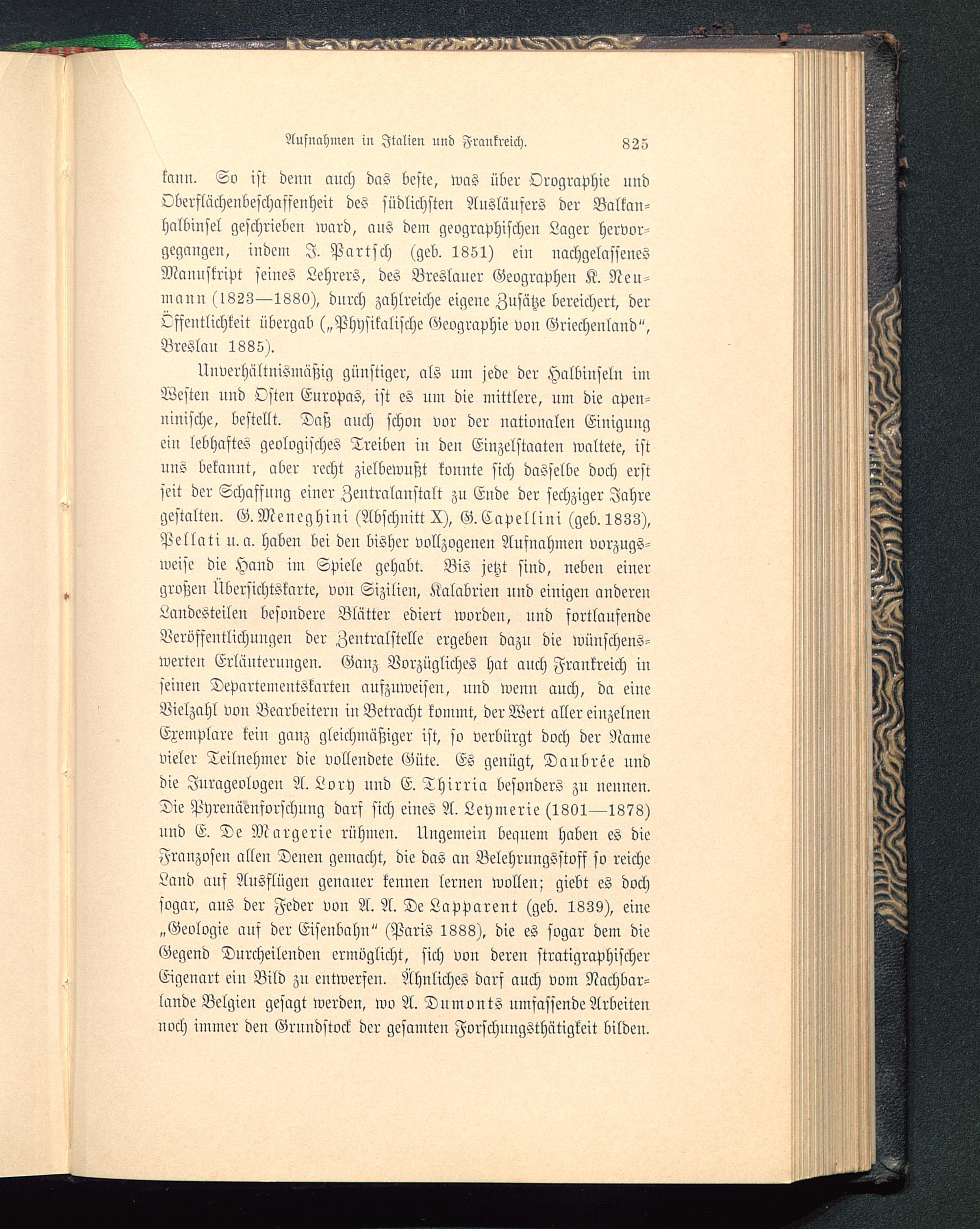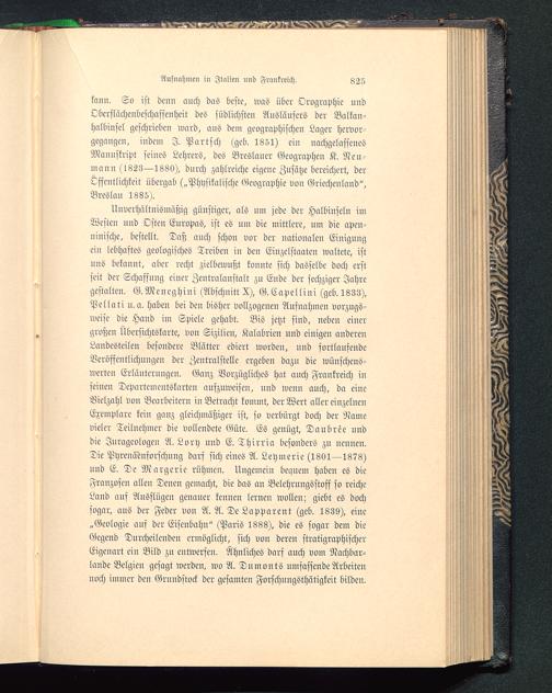 Unverhältnismäßig günstiger, als um jede der Halbinseln imWesten und Osten Europas , ist es um die mittlere, um die apen-ninische, bestellt. Daß auch schon vor der nationalen Einigungein lebhaftes geologisches Treiben in den Einzelstaaten waltete, istuns bekannt, aber recht zielbewußt konnte sich dasselbe doch erstseit der Schaffung einer Zentralanstalt zu Ende der sechziger Jahregestalten. G.Meneghini (Abschnitt X), G.Capellini (geb. 1833),Pellati u.a. haben bei den bisher vollzogenen Aufnahmen vorzugs-weise die Hand im Spiele gehabt. Bis jetzt sind, neben einergroßen Übersichtskarte, von Sizilien, Kalabrien und einigen anderenLandesteilen besondere Blätter ediert worden, und sortlaufendeVeröffentlichungen der Zentralstelle ergeben dazu die wünschens-werten Erläuterungen. Ganz Vorzügliches hat auch Frankreich inseinen Depnrtementskarten aufzuweisen, und wenn anch, da eineVielzahl von Bearbeitern in Betracht kommt, der Wert aller einzelnenExemplare kein ganz gleichmäßiger ist, so verbürgt doch der Namevieler Teilnehmer die vollendete Güte. ES genügt, Daubree unddie Jurageologeu A. Lory und E. Thirria besonders zu nennen.Die Pyrenäenforschung darf sich eiues A. Leymerie (1801—1878)und E. De Margerie rühmen. Nugeinein bequem haben es dieFranzosen allen Denen gemacht, die das an Belehrnngsstosf so reicheLand auf Ausflügen genauer kennen lernen wollen; giebt es dochsogar, aus der Feder von A. A. De Lapparent (geb. 1839), eine„Geologie auf der Eisenbahn" (Paris 1888), die es sogar dem dieGegend Durcheileudeu ermöglicht, sich von deren stratigraphischerEigenart ein Bild zu entwersen. Ähnliches darf auch vom Nachbar-lande Belgien gesagt werden, wo A. Dumonts umfassende Arbeitennoch immer den Grundstock der gesamten Forschuugsthätigkeit bilden.