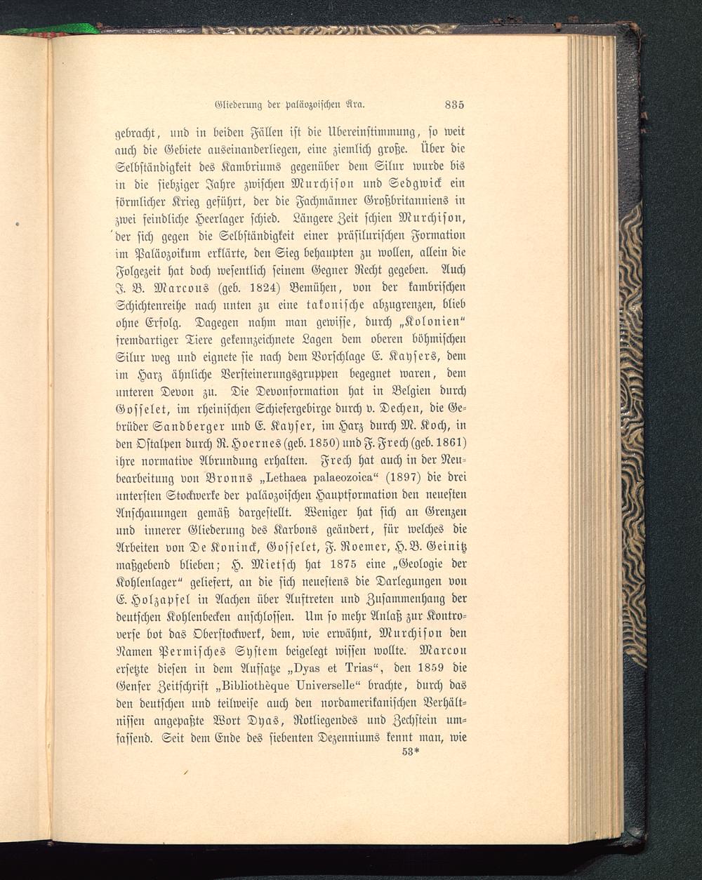 gebracht, und in beiden Fällen ist die Übereinstimmung, so weitauch die Gebiete auseinanderliegen, eine ziemlich große. Über dieSelbständigkeit des Kambriums gegenüber dem Silur wurde bisin die siebziger Jahre zwischen Murchison und Sedgwick einförmlicher Krieg geführt, der die Fachmänner Großbritanniens inzwei feindliche Heerlager schied. Längere Zeit schien Murchison,der sich gegen die Selbständigkeit einer Präsilurischen Formationim Paläozoikum erklärte, den Sieg behaupten zu wollen, allein dieFolgezeit hat doch wesentlich seinem Gegner Recht gegeben. AuchI. B. Marcous (geb. 1824) Bemühen, von der kambrischenSchichtenreihe nach unten zu eine ta konische abzugrenzen, bliebohne Erfolg. Dagegen nahm man gewisse, durch „Kolonien"fremdartiger Tiere gekennzeichnete Lagen dem oberen böhmischenSilur weg und eignete sie nach dem Vorschlage E. Kaysers, deniim Harz ähnliche Versteinerungsgruppen begegnet waren, demunteren Devon zu. Die Devonformation hat in Belgien durchGosselet, im rheinischen Schiefergebirge durch v. Dechen, die Ge-brüder Sandberger und E. Kayser, im Harz durch M. Koch, inden Ostalpen durch R. Hoernes (geb. 1850) und F. Frech (geb. 1861)ihre normative Abrundung erhalten. Frech hat auch in der Neu-bearbeitung von Bronns „liktliasg. pg,laeo2oieg," (1897) die dreiuntersten Stockwerke der paläozoischen Hauptformation den neuestenAnschauungen gemäß dargestellt. Weniger hat sich an Grenzenund innerer Gliederung des Karbons geändert, für welches dieArbeiten von De Koninck, Gosselet, F. Roemer, H.B. Geinitzmaßgebend blieben; H. Mietsch hat 1875 eine „Geologie derKohlenlager" geliefert, an die sich neuestens die Darlegungen vonE. Holzapfel in Aachen über Auftreten nnd Znsammenhang derdeutschen Kohlenbecken anschlössen. Um so mehr Anlaß zur Kontro-verse bot das Oberstockwerk, dem, wie erwähnt, Mnrchison denNamen Permisches System beigelegt wissen wollte. Marcouersetzte diesen iu dem Aufsatze „Ovs.8 et Irias", den 1859 dieGenfer Zeitschrift „Lil>1iotlleyus Universelle" brachte, durch dasden deutscheu und teilweise auch den nordamerikamschen Verhält-nissen angepaßte Wort Dyas, Notliegendes und Zechstein um-fassend. Seit dem Ende des siebenten Dezenniums kennt man, wie
