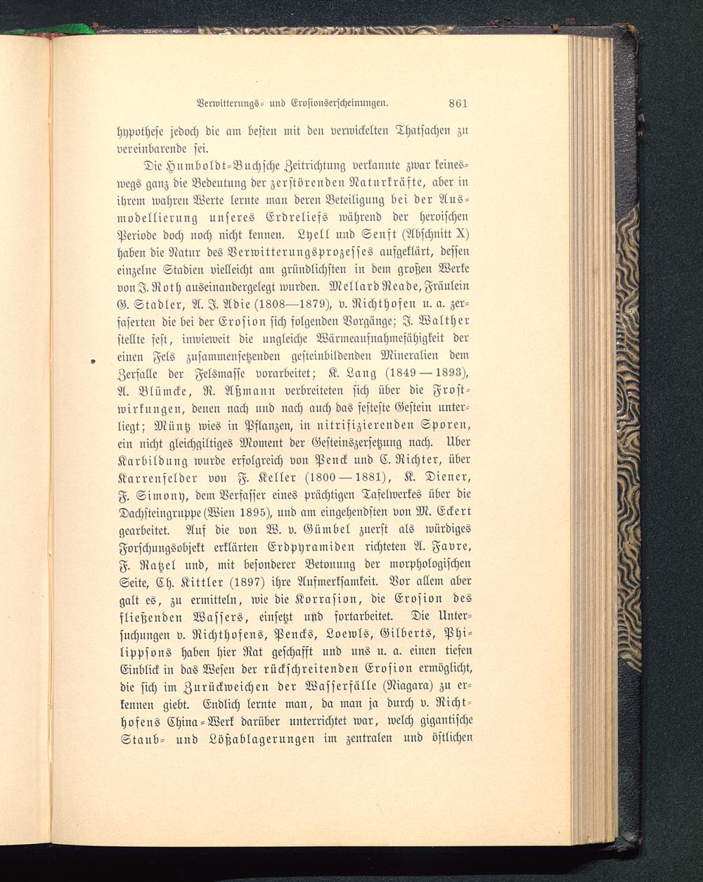 Die Hnmboldt-Buchsche Zeitrichtung verkannte zwar keines-wegs ganz die Bedeutung der zerstörenden Na turk raste, aber inihrem wahreu Werte lernte man deren Beteiligung bei der Aus-modellierung unseres Erdreliefs während der heroischenPeriode doch noch nicht kennen. Lyell und Senft (Abschnitt X)haben die Natur des Verwitterungsprozesses aufgeklart, desseneinzelne Stadien vielleicht am gründlichsten in dem großen Werkevon I. Roth auseinandergelegt wurden. Mellard Neade, FräuleinG. Stadler, A. I. Adie (1808—1879), v. Nichthofen n. a. zer-faserten die bei der Erosion sich folgenden Borgänge; I. Waltherstellte sest, inwieweit die ungleiche Wärmeaufnahmefähigkeit dereinen Fels zusammensetzenden gesteinbildenden Mineralien deinZerfalle der Felsmasse vorarbeitet; K. Lang (1849 — 1893),A. Blümcke, R. Aßmann verbreiteten sich über die Fr oft-Wirkungen, denen nach und nach anch das festeste Gestein unter-liegt; Müntz wies in Pflanzen, in nitrifizierenden Sporen,ein nicht gleichgiltiges Moment der Gesteinszersetzung nach. ÜberKarbildung wurde erfolgreich von Penck und C. Richter, überKarrenfelder von F. Keller (1800 — 1881), K. Diener,F. Simony , dem Verfasser eines prächtigen Tafelwerkes über dieDachsteingruppe (Wien 1895), und am eingehendsten von M. Eckertgearbeitet. Auf die von W. v. Gümbel zuerst als würdigesForschuugsobjekt erklärten Erdpyramiden richteten A. Favre.F. Natzel und, mit besonderer Betonung der morphologischenSeite, Eh. Kittler (1897) ihre Aufmerksamkeit. Vor allem abergalt es, zu ermitteln, wie die Korrasion, die Erosion desfließenden Wassers, einsetzt und fortarbeitet. Die Unter-suchungen v. Richthofens, Pencks, Loewls, Gilberts, Phi-lipps ons haben hier Rat geschafft und uns u. a. einen tiefenEinblick in das Weseu der rückschreitenden Erosion ermöglicht,die sich im Zurückweichen der Wasserfälle (Niagara) zu er-keuueu giebt. Endlich lernte man, da man ja durch v. Richt-hofens China-Werk darüber unterrichtet war, welch gigantischeStaub- und Lößablageruugen im zentralen und östlichen