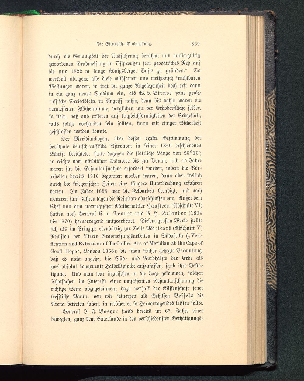 Der Meridianbogen, über dessen exakte Bestimmung derberühmte deutsch -russische Astronom in seiner 1860 erschienenenSchrift berichtete, hatte dagegen die stattliche Länge von 25° 10';er reichte vom nördlichen Eismeere bis zur Donau , und 45 Jahrewaren sür die Gesamtaufnahme erfordert worden, indem die Vor-arbeiten bereits 1810 begonnen worden waren, dann aber freilichdurch die kriegerischen Zeiten eine längere Unterbrechung erfahrenhatten. Im Jahre 1855 war die Feldarbeit beendigt, nnd nachweiteren fünf Jahren lagen die Resultate abgeschlossen vor. Anßer demChef und dem norwegischen Mathematiker Hansteen (Abschnitt VI)hatten noch Geueral C. v. Tenner und N. H. Selander (1804bis 1870) hervorragend mitgearbeitet. Diesem großen Werke stelltesich als im Prinzipe ebenbürtig zur Seite Maclears (Abschnitt V)Revision der älteren Gradmessungsarbeiten in Südafrika (,Vsri-lleation anä Lxtsnsion I^g, (!g,i1Iö8 ^.ro ok Nsriclian at ins <üg.pö ok6ooä Hops", London 1866); die schon früher gehegte Vermutung,daß es uicht augehe, die Süd- und Nordhälfte der Erde alszwei absolut kongruente Halbetlipsoide aufzufassen, sand ihre Bestä-tigung. Und man war inzwischen in die Lage gekommen, solchenThatsachen im Interesse einer umfassenden Gesamtanschanung dierichtige Seite abzugewinnen; dazu verhalf der Wissenschaft jenertreffliche Mann, den wir seinerzeit als Gehilfen Bessels dieArena betreten sahen, in welcher er so Hervorragendes leisten sollte.