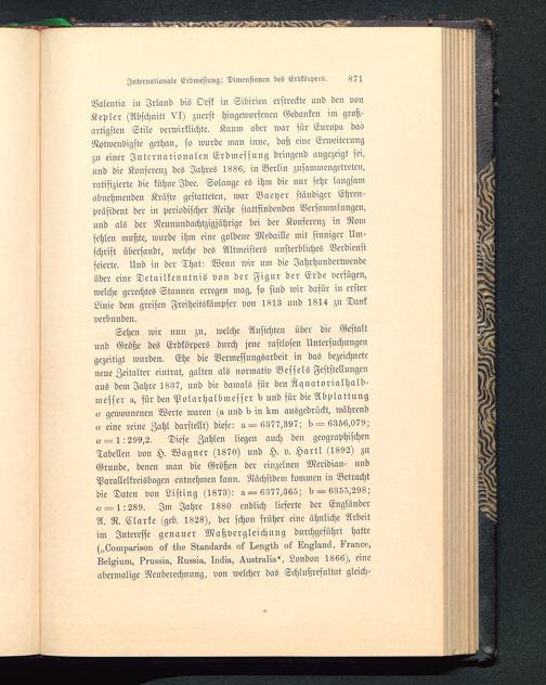 Valentin in Irland bis Orsk in Sibirien erstreckte und den vonKepler (Abschnitt VI) zuerst hingeworfenen Gedanken im groß-artigsten Stile verwirklichte. Kaum aber war für Europa dasNotwendigste gethan, so wurde man inne, daß eine Erweiterungzu einer Internationalen Erdmessung dringend angezeigt sei,und die Konferenz des Jahres 1886, in Berlin zusammengetreten,ratifizierte die kühue Idee. Solange es ihm die nur sehr langsamabnehmenden Kräfte gestatteten, war Baeyer ständiger Ehren-präsident der in periodischer Reihe stattfindenden Versammlungen,und als der Neunundachtzigjährige bei der Konferenz in Rom fehlen mußte, wurde ihm eine goldene Medaille mit sinniger Um-schrift übersandt, welche des Altmeisters unsterbliches Verdienstfeierte. Und in der That: Wenn wir um die Jahrhundertwendeüber eine Detailkenntnis von der Figur der Erde verfügen,welche gerechtes Staunen erregen mag, so sind wir dafür in ersterLinie dem greisen Freiheitskämpfer von 1813 und 1814 zu Daukverbunden.