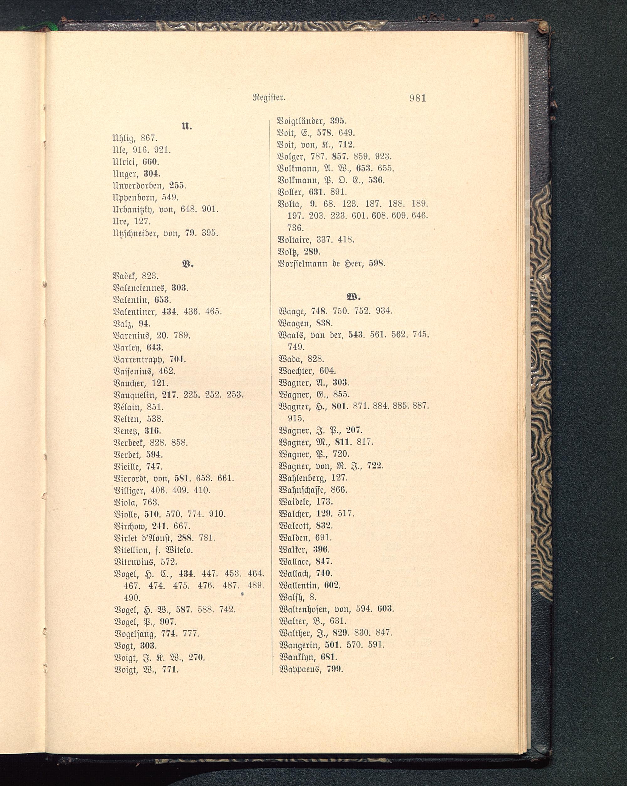 Voigtländer , 395.Voit, E., »78. 649.Voit, von, K., 712.Volger, 787. 857. 859. 923.Volkmann, A. W,, «53. 655.Volkmann, P. O. E., 53«.Voller, «31. 891.