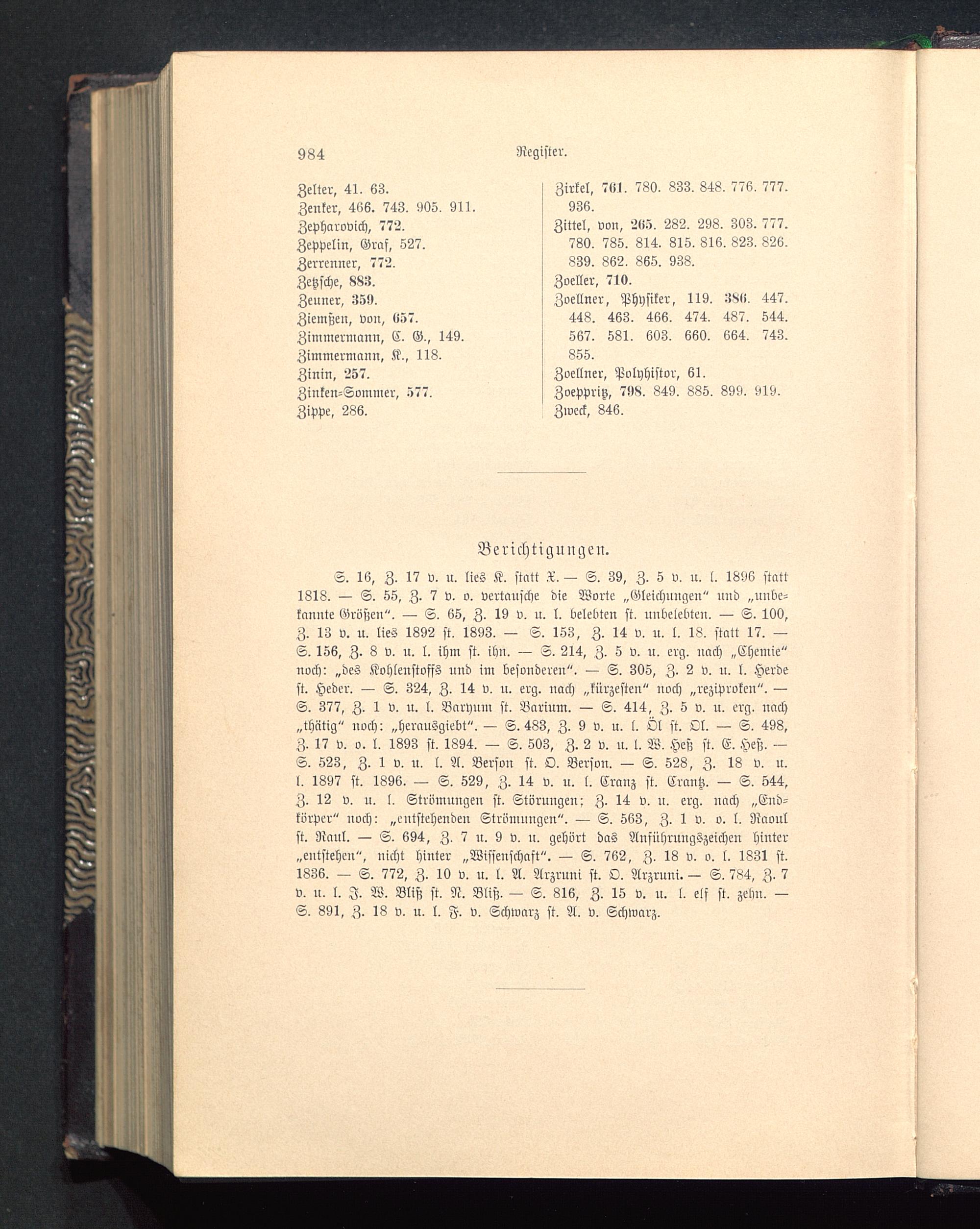 Zelter, 41. 63.Zenker, 466. 743. 905. 911.Zepharovich, 772.Zeppelin, Graf, S27.Zerrermer, 772.Zetzsche, 883.Zeuner, 359.Ziemßen, von, 657.Zinnnerniann, C. G., 149.Zimmermann, K., 118.Zinin, 257.Zinken-Sommer, 577.Zippe, 286.