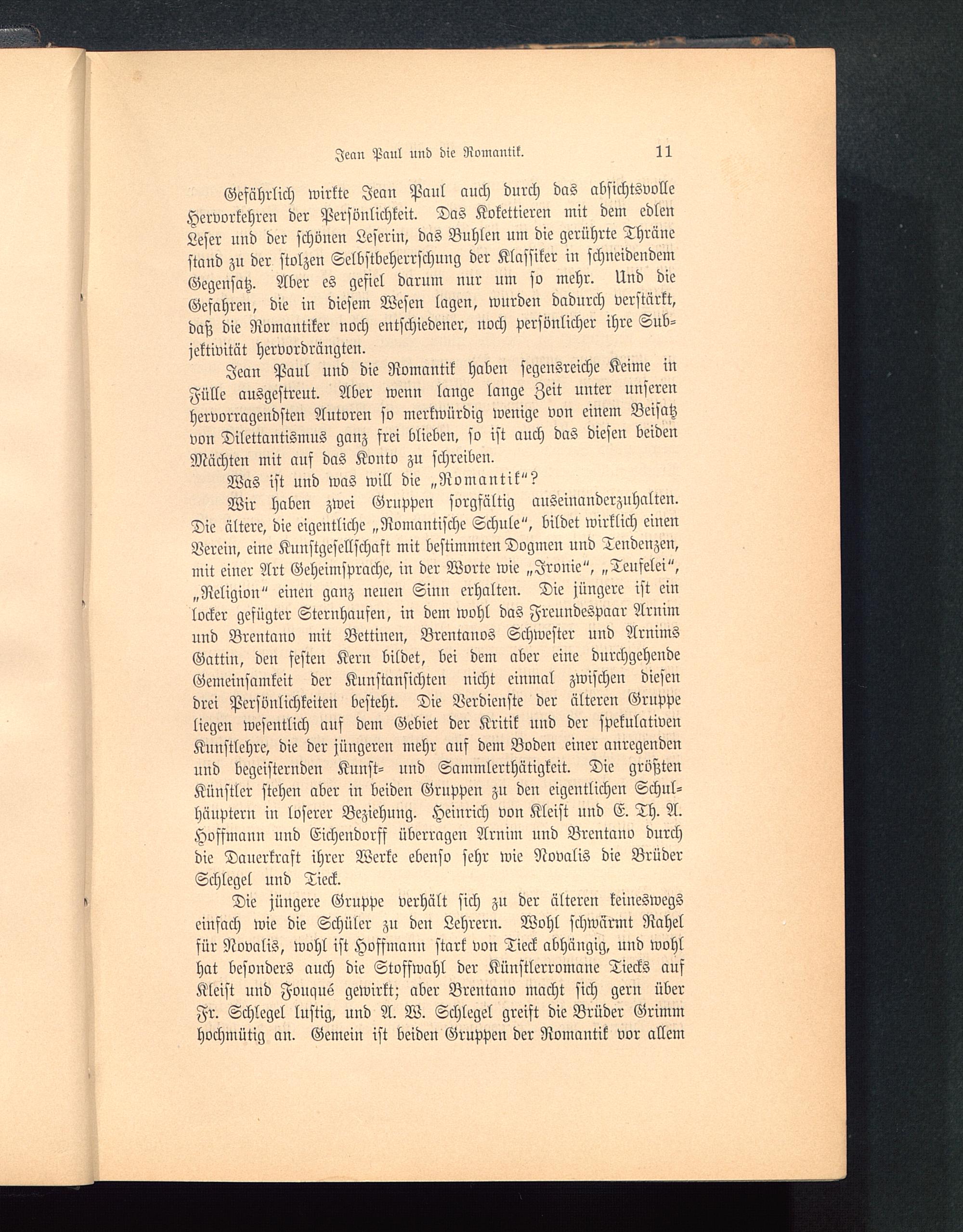 Die jüngere Gruppe verhält sich zu der älteren keineswegseinfach wie die Schüler zu den Lehrern. Wohl schwärmt Nahelfür Novalis, wohl ist Hoffmann stark von Tieck abhängig, und wohlhat besonders auch die Stofswahl der Künstlerromane Tiecks aufKleist und Fouqus gewirkt; aber Brentano macht sich gern überFr. Schlegel lustig, und A. W. Schlegel greift die Brüder Grimm hochmütig an. Gemein ist beiden Gruppen der Romantik vor allem