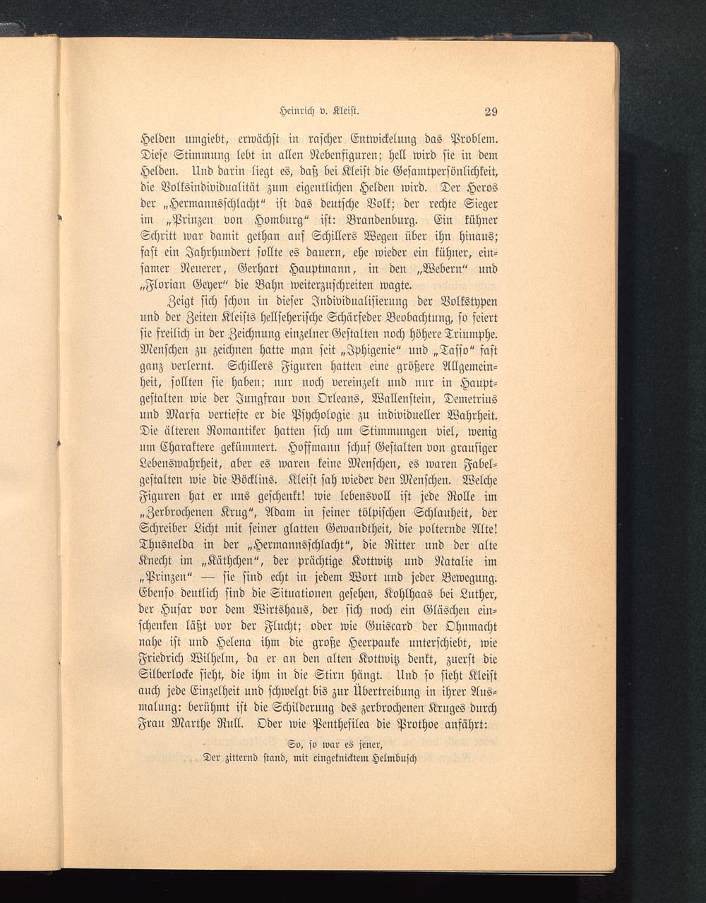 Zeigt sich schon in dieser Individualisierung der Voltstypenund der Zeiten Kleists hellseherische Schärfeder Beobachtung, so feiertsie freilich in der Zeichnung einzelner Gestalten noch höhere Triumphe.Menschen zu zeichnen hatte man seit „Jphigenie" und „Tasso" fastganz verlernt. Schillers Figureu hatten eine größere Allgemein-heit, sollten sie haben; nur noch vereinzelt und nur in Haupt-gestalteu wie der Jungfrau von Orleans, Wallenstein, Demetriusund Marfa vertiefte er die Psychologie zu individueller Wahrheit.Die älteren Nomantiker hatten sich um Stimmungen viel, wenigum Charaktere gekümmert. Hoffmann schnf Gestalten von grausigerLebenswahrheit, aber es waren keine Menschen, es waren Fabel-gestalten wie die Böcklins. Kleist sah wieder den Menschen. WelcheFignren hat er uns geschenkt! wie lebensvoll ist jede Rolle im„Zerbrochenen Krug ", Adam in seiner tölpischen Schlauheit, derSchreiber Licht mit seiner glatten Gewandtheit, die polternde Alte!Thusnelda in der „Hermannsschlacht ", die Ritter und der alteKnecht im „Käthchen ", der prächtige Kottwitz und Natalie im„Prinzen" — sie sind echt in jedem Wort und jeder Bewegung.Ebenso deutlich sind die Situationen gesehen, Kohlhaas bei Luther,der Husar vor dem Wirtshaus, der sich noch ein Gläschen ein-schenken läßt vor der Flucht; oder wie Guiscard der Ohnmachtnahe ist und Helena ihm die große Heerpauke unterschiebt, wieFriedrich Wilhelm, da er an den alten Kottwitz denkt, zuerst dieSilberlocke sieht, die ihm in die Stirn hängt. Und so sieht Kleistauch jede Einzelheit und schwelgt bis zur Übertreibung in ihrer Aus-malung: berühmt ist die Schilderung des zerbrochenen Krnges durchFrau Marthe Null. Oder wie Penthesilea die Prothoe anfährt: