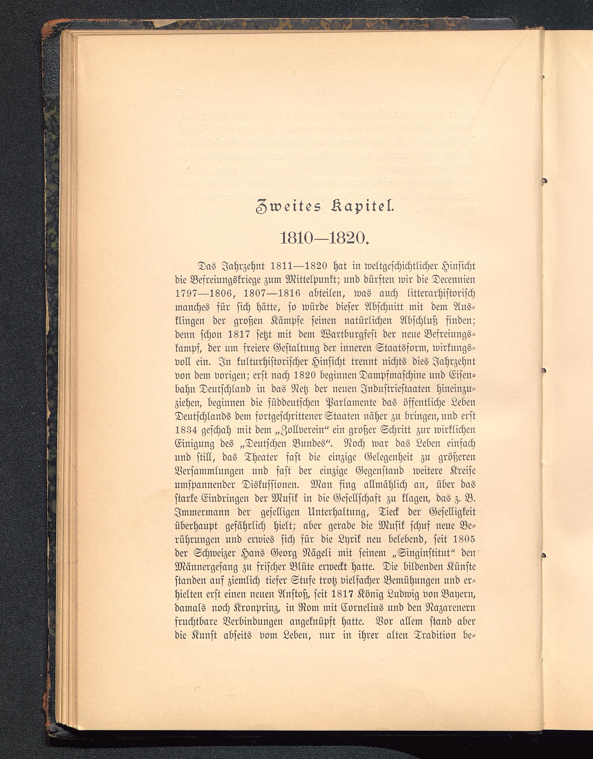 Das Jahrzehnt 1811—1820 hat in weltgeschichtlicher Hinsichtdie Befreiungskriege zum Mittelpunkt; und dürften wir die Decennien1797—1806, 1807—1816 abteilen, was auch literarhistorischmanches für sich hätte, so würde dieser Abschnitt mit dem Aus-klingen der großen Kämpfe seinen natürlichen Abschluß finden;denn schon 1817 setzt mit dem Wartburgfest der neue Befreiungs-kampf, der um freiere Gestaltung der inneren Staatsform, wirkungs-voll ein. In kulturhistorischer Hinsicht trennt nichts dies Jahrzehntvon dem vorigen; erst nach 1820 beginnen Dampfmaschine und Eisen-bahn Deutschland in das Netz der neuen Industriestaaten hineinzu-ziehen, beginnen die süddeutschen Parlamente das öffentliche LebenDeutschlands dem fortgeschrittener Staaten näher zu bringen, und erst1834 geschah mit dem „Zollverein " ein großer Schritt zur wirklichenEinigung des „Deutschen Bundes ". Noch war das Leben einfachund still, das Theater fast die einzige Gelegenheit zu größereuVersammlungen und fast der einzige Gegenstand weitere Kreiseumspannender Diskussionen. Man sing allmählich an, über dasstarke Eindringen der Musik in die Gesellschaft zu klagen, das z. B.Jmmermann der geselligen Unterhaltung, Tieck der Geselligkeitüberhaupt gefährlich hielt; aber gerade die Musik schuf neue Be-rührungen und erwies sich für die Lyrik neu belebend, seit 1805der Schweizer Hans Georg Nägeli mit seinem „Singinstitut" denMännergesang zu srischer Blüte erweckt hatte. Die bildenden Künstestanden auf ziemlich tiefer Stufe trotz vielfacher Bemühungen und er-hielten erst einen neuen Anstoß, seit 1817 König Ludwig von Bayern,damals noch Kronprinz, in Rom mit Cornelius und den Nazarenernfruchtbare Verbindungen angeknüpft hatte. Vor allem stand aberdie Kunst abseits vom Leben, nur in ihrer alten Tradition be-