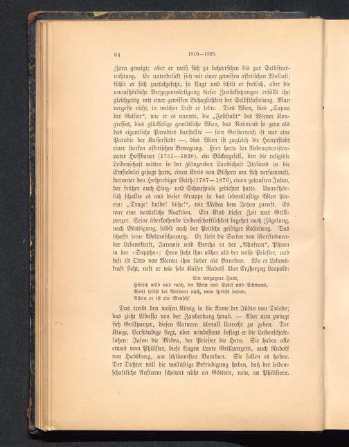 Zorn geneigt; aber er weiß sich zu beherrschen bis zur Selbstver-nichtuug. Er unterdrückt sich mit einer gewissen asketischen Wollust;fühlt er sich zurückgesetzt, so klagt und schilt er freilich, aber dieunaufhörliche Vergegenwärtigung dieser Zurücksetzungen erfüllt ihngleichzeitig mit einer gewissen Behaglichkeit der Selbstkasteiung. Manvergesse nicht, in welcher Luft er lebte. Dies Wien , dies „Capuader Geister", wie er es nannte, die „Feststadt" des Wiener Kon-gresses, dies glückselige gemütliche Wien , das Raimund so gern alsdas eigentliche Paradies darstellte — sein Geisterreich ist nur eineParodie der Kaiserstadt —, dies Wien ist zugleich die Hauptstadteiner starken asketischen Bewegung. Hier hatte der Redemptoristen -pater Hossbauer (1751—1820), ein Bäckergesell, den die religiöseLeidenschaft mitten iu der glänzenden Landschaft Italiens in dieEinsiedelei gejagt hatte, einen Kreis von Büßern um sich versammelt,darunter den Hofprediger Veith (1787 —1876), einen getauften Juden,der früher auch Sing- und Schauspiele gedichtet hatte. Unaufhör-lich schallte es aus dieser Gruppe in das lebenslustige Wien hin-ein: „Trage! dulde! büße!", wie Medea dem Jason zuruft. Eswar eine natürliche Reaktion. Ein Kind dieser Zeit war Grill-parzer. Seine überkochende Leidenschaftlichkeit begehrt nach Zügelung,nach Bändigung, selbst nach der Peitsche geistiger Kasteiung. Dasschafft seine Weltanschauung. Er liebt die Seelen von überströmen-der Lebenskraft, Jaromir und Bertha in der „Ahnfrau", Phaouin der »Sappho «; Hero steht ihm näher als der weise Priester, undfast ist Otto von Meran ihm lieber als Baueban. Wo er Lebens-kraft sieht, ruft er wie sein Kaiser Rudolf über Erzherzog Leopold: