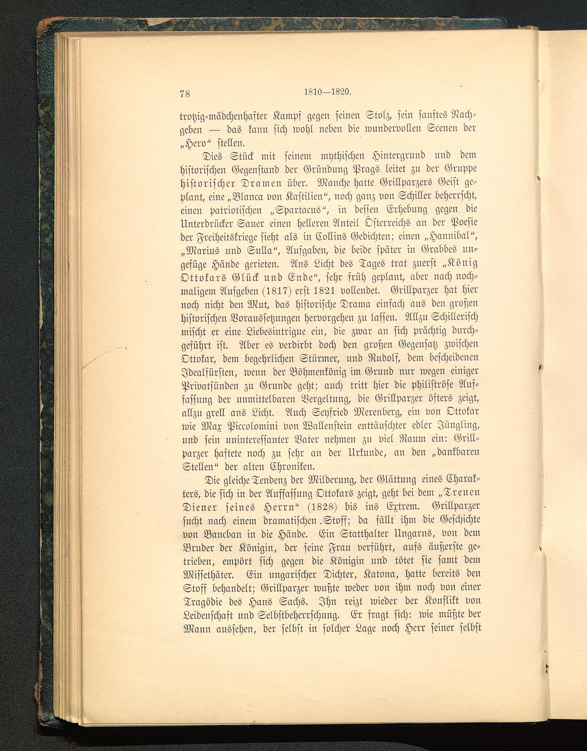 Dies Stück mit seinem mythischen Hintergrund uud demhistorischen Gegenstand der Gründung Prags leitet zu der Gruppehistorischer Dramen über. Manche hatte Grillparzers Geist ge-plant, eine „Blanca von Kastilieu", noch ganz von Schiller beherrscht,einen patriotischen „Spartacns", in dessen Erhebung gegen dieUnterdrücker Sauer einen helleren Anteil Österreichs an der Poesieder Freiheitskriege sieht als in Collins Gedichten: einen „Haunibal",„Marius und Sulla ", Aufgaben, die beide später in Grabbes un-gefüge Hände gerieten. Ans Licht des Tages trat zuerst „KönigOttokars Glück und Ende ", sehr früh geplant, aber nach noch-maligem Aufgeben (1817) erst 1821 vollendet. Grillparzer hat hiernoch nicht den Mut, das historische Drama einfach aus deu große»historischen Voraussetzungen hervorgehen zu lassen. Allzu Schillerischmischt er eine Liebesintrigue ein, die zwar an sich prächtig durch-geführt ist. Aber es verdirbt doch deu großen Gegensatz zwischenOttokar, dem begehrlichen Stürmer, nnd Rudolf, dem bescheidenenJdealsürsten, wenn der Böhmenkönig im Grund nur wegen einigerPrivatsünden zu Grunde geht; auch tritt hier die philiströse Auf-fassung der unmittelbaren Vergeltung, die Grillparzer öfters zeigt,allzu grell ans Licht. Auch Seyfried Merenberg, ein von Ottokarwie Max Piccolomini von Wallcnstein enttäuschter edler Jüngling,und sein uuinteressanter Vater nehmen zn viel Raum ein: Grill-parzer hastete noch zu sehr an der Urkunde, au den „dankbarenStellen" der alten Chroniken.