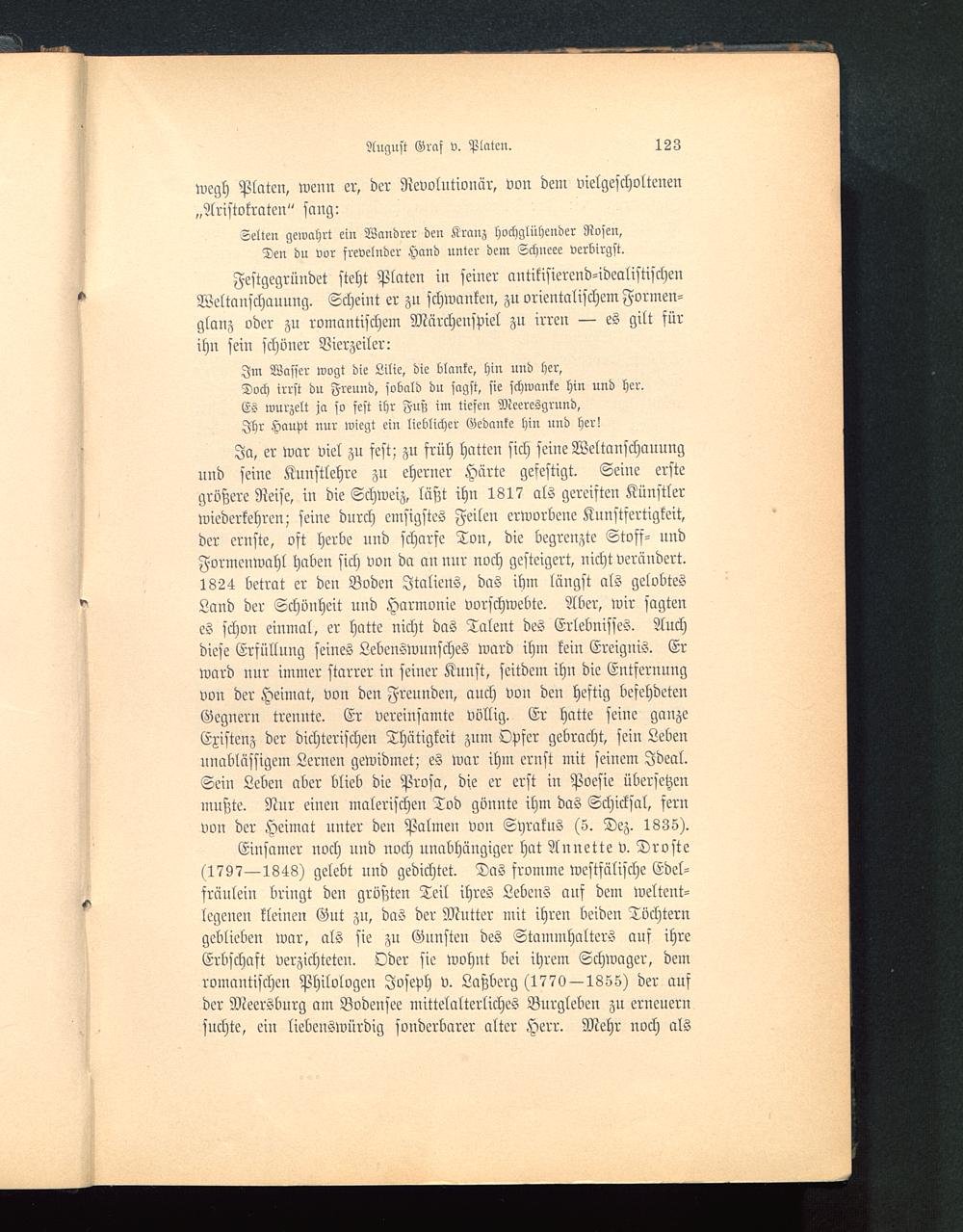 Ja, er war viel zn fest; zu früh hatten sich seine Weltanschauungund seine Kunstlehre zu eherner Härte gefestigt. Seine erstegrößere Reise, in die Schweiz , läßt ihn 1817 als gereiften Künstlerwiederkehren; seine durch emsigstes Feilen erworbene Kunstfertigkeit,der ernste, oft herbe und scharfe Ton, die begrenzte Stoff- undFormenwahl haben sich von da an nur noch gesteigert, nicht verändert.1824 betrat er den Boden Italiens , das ihm längst als gelobtesLand der Schönheit und Harmonie vorschwebte. Aber, wir sagtenes schon einmal, er hatte nicht das Talent des Erlebnisses. Auchdiese Erfüllung seines Lebenswunsches ward ihm kein Ereignis. Erward nur immer starrer in seiner Kunst, seitdem ihn die Entfernungvon der Heimat, von den Freunden, auch von den heftig befehdetenGegnern trennte. Er vereinsamte völlig. Er hatte seine ganzeExistenz der dichterischen Thätigkeit znm Opfer gebracht, sein Lebenunablässigem Lernen gewidmet; es war ihm ernst mit seinem Ideal.Sein Leben aber blieb die Prosa, die er erst in Poesie übersetzenmußte. Nur einen malerischen Tod gönnte ihm das Schicksal, fernvon der Heimat nnter den Palmen von Syratus (5. Dez. 1835).