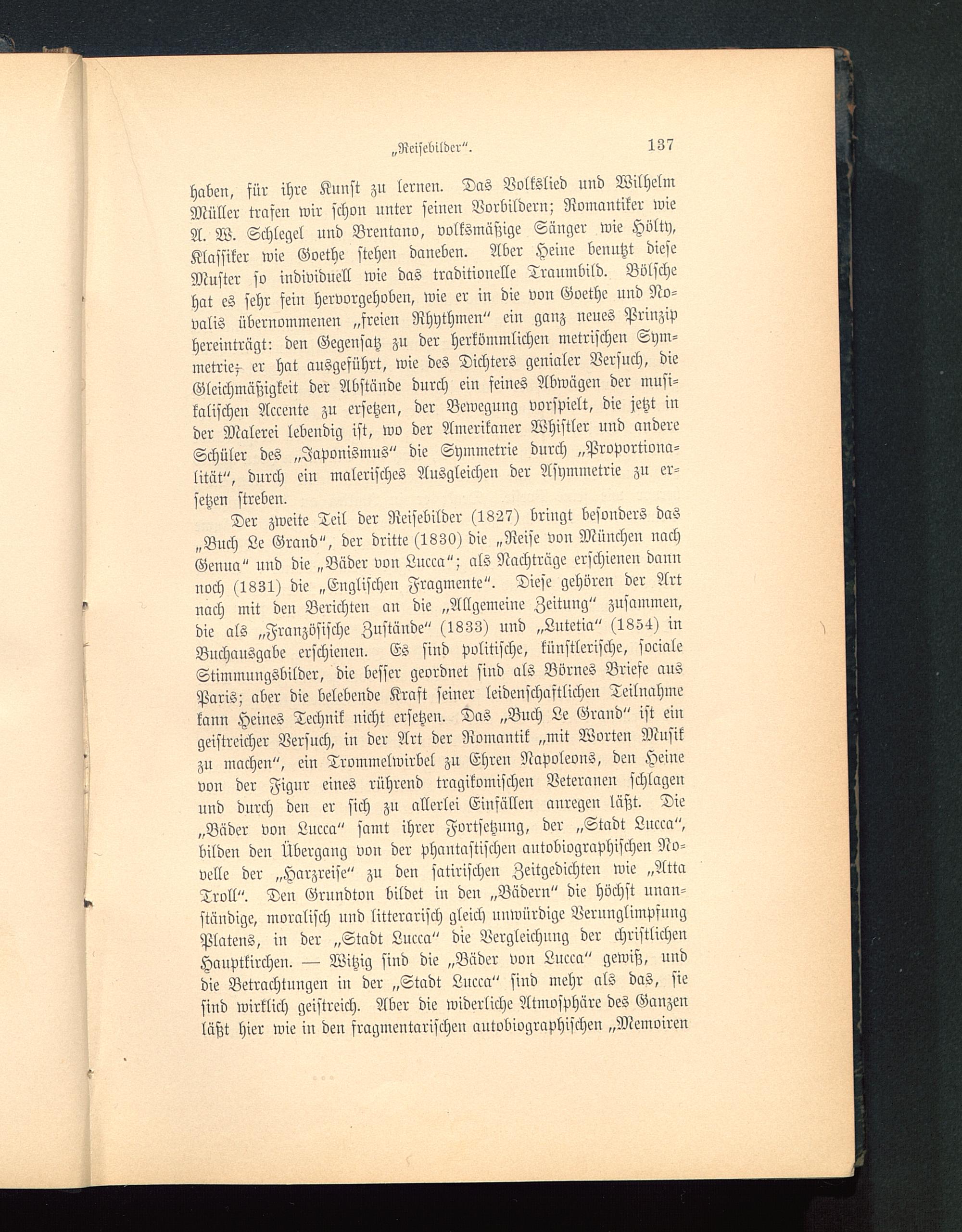 Der zweite Teil der Reisebilder (1827) bringt besonders das„Buch Le Grand", der dritte (1830) die „Reise von München nachGenua" und die „Bäder von Lucca"; als Nachträge erschienen dannnoch (1831) die „Englischen Fragmente". Diese gehören der Artnach mit den Berichten an die „Allgemeine Zeituug" zusammen,die als „Französische Zustände" (1833) und „Lutetia" (1854) inBuchausgabe erschienen. Es sind politische, künstlerische, socialeStimmungsbilder, die besser geordnet sind als Börnes Briefe ausParis ; aber die belebende Kraft seiner leidenschaftlichen Teilnahmekann Heines Technik nicht ersetzen. Das „Buch Le Grand" ist eingeistreicher Versuch, in der Art der Romantik „mit Worten Musikzu machen", ein Trommelwirbel zu Ehren Napoleons, den Heinevon der Figur eines rührend tragikomischen Veteranen schlagenund durch den er sich zu allerlei Einfällen anregen läßt. Die„Bäder von Lncca" samt ihrer Fortsetzung, der „Stadt Lucca",bilden deu Übergang von der phantastischen autobiographischen No-velle der „Harzreise" zu den satirischen Zeitgedichten wie „AttaTroll ". Den Grnndton bildet in den „Bädern" die höchst unan-ständige, moralisch und litterarisch gleich unwürdige VerunglimpfungPlatens, iu der „Stadt Lucca" die Vergleichung der christlichenHanptkirchen. — Witzig sind die „Bäder von Lucca" gewiß, unddie Betrachtungen in der „Stadt Lncca" sind mehr als das, siesind wirklich geistreich. Aber die widerliche Atmosphäre des Ganzenläßt hier wie in den fragmentarischen antobiographischen „Memoiren
