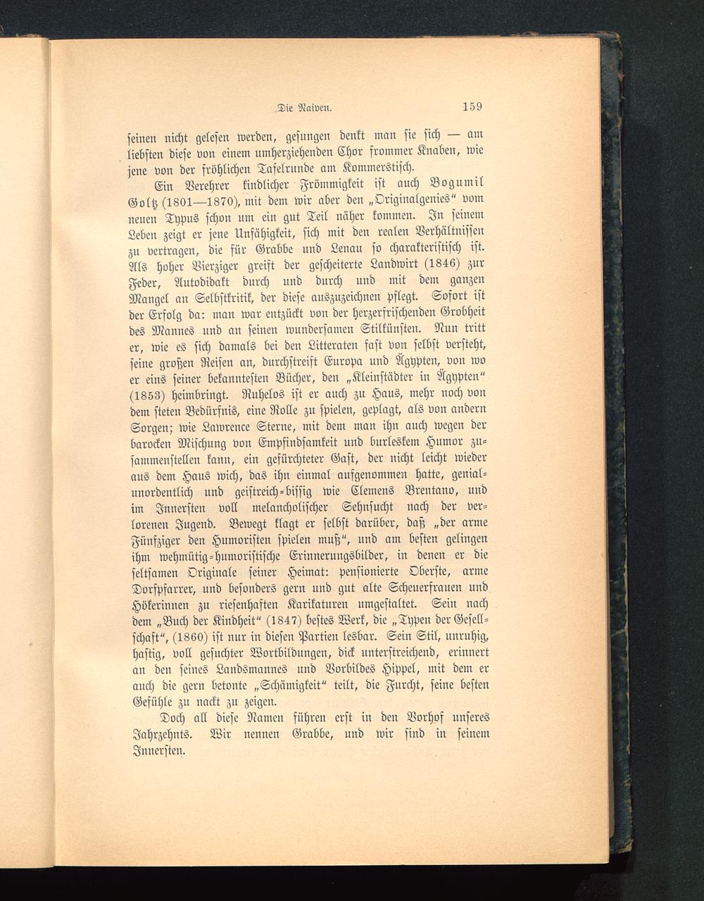 Ein Verehrer kindlicher Frömmigkeit ist auch BogumilGoltz (1801—1870), mit dem wir aber den „Originalgenies" vomneuen Typus schon um ein gut Teil uäher kommen. In seinen:Leben zeigt er jene Unfähigkeit, sich mit den realen Verhältnissenzu vertragen, die für Grabbe und Lenau so charakteristisch ist.Als hoher Vierziger greift der gescheiterte Landwirt (1846) zurFeder, Autodidakt durch und durch uud mit dem ganzenMangel an Selbstkritik, der diese auszuzeichnen pflegt. Sofort istder Erfolg da: man war entzückt von der herzerfrischenden Grobheitdes Mannes und an seinen wundersamen Stilkünsten. Nun tritter, wie es sich damals bei den Litteraten fast von selbst versteht,seine großen Reisen an, durchstreift Europa und Ägypten , von woer eins seiner bekanntesten Bücher, den „Kleinstädter in Ägypten "(1853) heimbringt. Ruhelos ist er auch zu Haus, mehr noch vondem steten Bedürfnis, eine Rolle zu spielen, geplagt, als von andernSorgen; wie Lawrence Sterne , mit dem man ihn auch wegen derbarocken Mischung von Empfindsamkeit und burleskem Humor zu-sammenstellen kann, ein gefurchtster Gast, der nicht leicht wiederaus dem Haus wich, das ihn einmal aufgenommen hatte, genial-uuordentlich und geistreich-bissig wie Clemens Brentano , undim Innersten voll melancholischer Sehnsucht nach der ver-lorenen Jugend. Bewegt klagt er selbst darüber, daß „der armeFünfziger den Humoristen spielen muß", und am besten gelingenihm wehmütig-humoristische Erinnerungsbilder, in denen er dieseltsamen Originale seiner Heimat: pensionierte Oberste, armeDorfpfarrer, und besonders gern und gut alte Scheuerfrauen undHökerinnen zu riesenhaften Karikaturen umgestaltet. Sein nachdem „Buch der Kindheit" (1847) bestes Werk, die „Typen der Gesell-schaft", (1860) ist nur in diesen Partien lesbar. Sein Stil, unrnhig,hastig, voll gesuchter Wortbildungen, dick unterstreichend, erinnertan deu seines Landsmannes und Vorbildes Hippel, mit dem erauch die gern betonte „Schämigkeit" teilt, die Furcht, seine bestenGefühle zu nackt zu zeigeu.