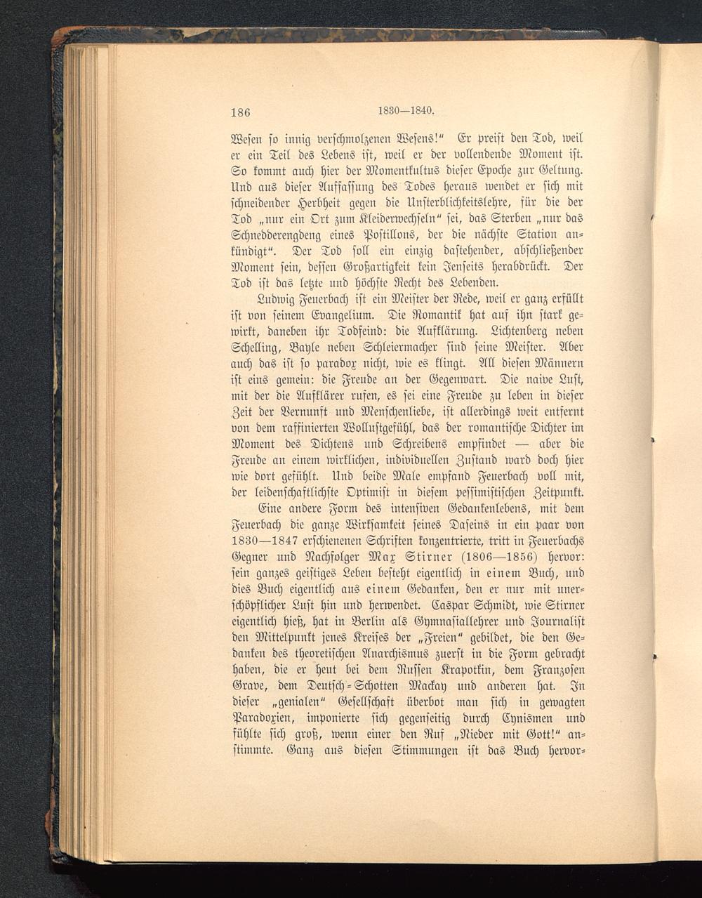 Eine andere Form des intensiven Gedankenlebens, mit demFeuerbach die ganze Wirksamkeit seines Daseins in ein paar von1830—1847 erschienenen Schriften konzentrierte, tritt in FenerbachsGegner und Nachfolger Max Stirner (1806—1856) hervor:sein ganzes geistiges Leben besteht eigentlich in einem Bnch, nnddies Buch eigentlich aus einem Gedanken, den er nur mit uner-schöpflicher Lust hin und herwendet. Caspar Schmidt, wie Stirner eigentlich hieß, hat in Berlin als Gymnasiallehrer und Journalistden Mittelpunkt jenes Kreises der „Freien" gebildet, die den Ge-danken des theoretischen Anarchismus zuerst in die Form gebrachthaben, die er heut bei dem Russen Krapotkin, dem Franzosen Grave, dem Deutsch -Schotten Mackay und anderen hat. Indieser „genialen" Gesellschaft überbot man sich in gewagtenParadoxien, imponierte sich gegenseitig dnrch Cynismen undfühlte sich groß, wenn einer den Ruf „Nieder mit Gott !" an-stimmte. Ganz aus diesen Stimmungen ist das Buch hervor-