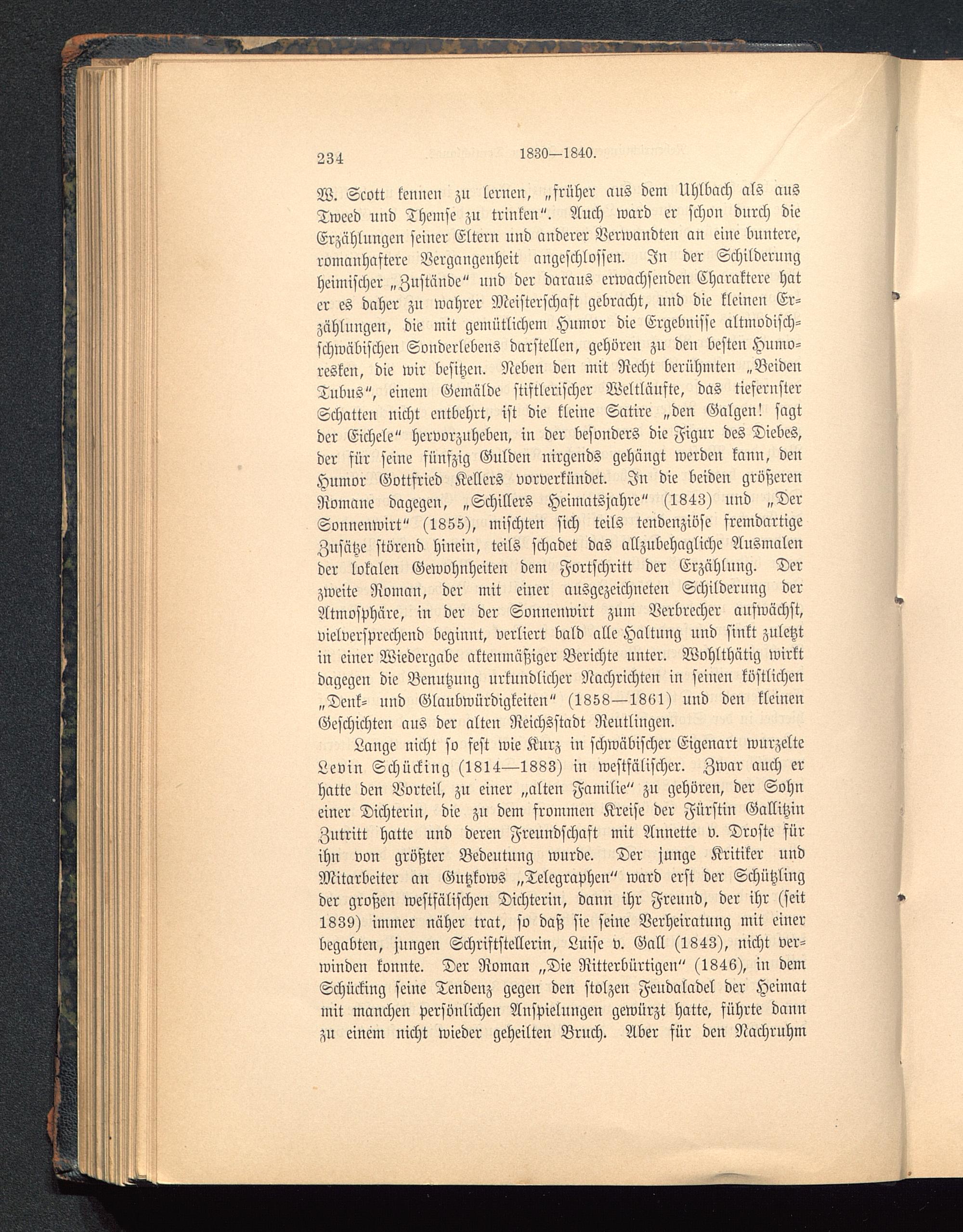 Lange nicht so fest wie Knrz in schwäbischer Eigenart wurzelteLevin Schückiug (1814—1883) in westfälischer. Zwar auch erhatte den Vorteil, zu einer „alten Familie" zn gehören, der Sohneiner Dichterin, die zu dem frommen Kreise der Fürstin Gallitzin Zutritt hatte und deren Freundschaft mit Annette v. Droste fürihn von größter Bedeutung wurde. Der junge Kritiker undMitarbeiter an Gutzkows „Telegrapheu" ward erst der Schützlingder großen westfälischen Dichterin, dann ihr Frennd, der ihr (seit1839) immer näher trat, so daß sie seine Verheiratung mit einerbegabten, jungen Schriftstellerin, Luise v. Gall (1843), nicht ver-winden konnte. Der Roman „Die Nitterbürtigen" (1846), in demSchücking seine Tendenz gegen den stolzen Feudaladel der Heimatmit manchen persönlichen Anspielungen gewürzt hatte, führte dannzu einem nicht wieder geheilten Bruch. Aber für den Nachruhm