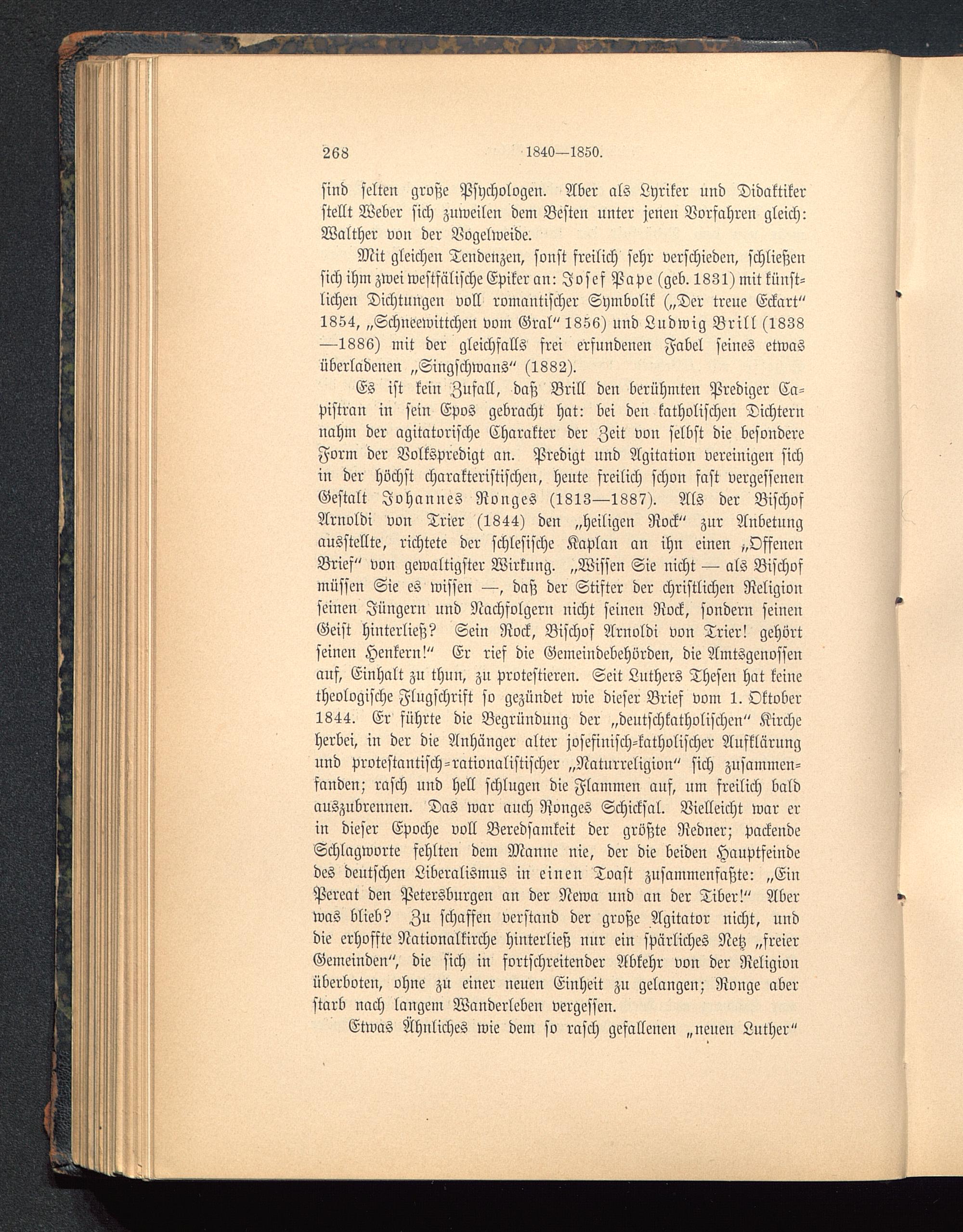Es ist kein Zufall, daß Brill den berühmten Prediger Ca-pistran in sein Epos gebracht hat: bei den katholischen Dichternnahm der agitatorische Charakter der Zeit von selbst die besondereForm der Volkspredigt an. Predigt und Agitation vereinigen sichin der höchst charakteristischen, hente freilich schon fast vergessenenGestalt Johannes Ronges (1813—1887). Als der BischofArnoldi von Trier (1844) den „heiligen Rock" znr Anbetungausstellte, richtete der schlesische Kaplan an ihn einen ^OffenenBrief " von gewaltigster Wirkung. „Wissen Sie nicht — als Bischofmüssen Sie es wissen —, daß der Stifter der christlichen Religionseinen Jüngern und Nachfolgern uicht seinen Rock, sondern seinenGeist hinterließ? Sein Rock, Bischof Arnoldi von Trier! gehörtseinen Henkern!" Er rief die Gemeindebehörden, die Amtsgenossenauf, Einhalt zu thun, zn protestieren. Seit Luthers Thesen hat keinetheologische Flugschrift so gezündet wie dieser Brief vom 1. Oktober1844. Er führte die Begründung der „deutschkatholischen" Kircheherbei, in der die Anhänger alter josefinisch-katholischer Aufklärungund protestantisch-rationalistischer „Naturreligion" sich zusammen-fanden; rasch und hell schlugen die Flammen auf, um freilich baldauszubrennen. Das war auch Ronges Schicksal. Vielleicht war erin dieser Epoche voll Beredsamkeit der größte Redner; packendeSchlngworte sehlten dem Manne nie, der die beiden Hauptfeindedes deutschen Liberalismus in einen Toast zusammenfaßte: „EiuPereat den Petersburgen an der Newa und an der Tiber !" Aberwas blieb? Zu schaffen verstand der große Agitator nicht, unddie erhoffte Nationalkirche hinterließ nur ein spärliches Netz „freierGemeinden", die sich in fortschreitender Abkehr von der Religionüberboten, ohne zu einer neuen Einheit zu gelangen; Ronge aberstarb nach langem Wanderleben vergessen.