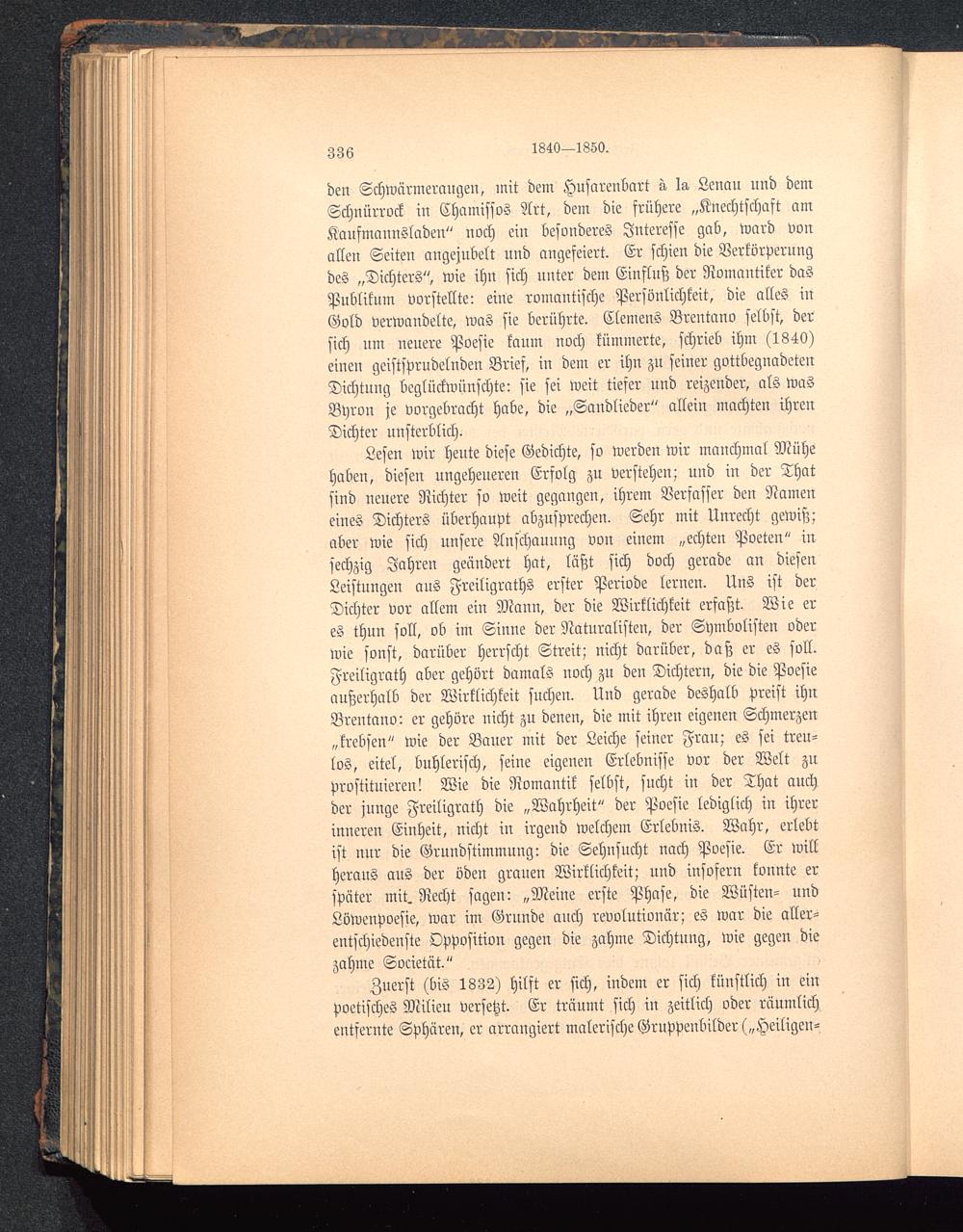 Lesen wir heute diese Gedichte, so werden wir manchmal Mühehaben, diesen nngeheneren Erfolg zu verstehen; und in der Thatsind neuere Richter so weit gegangen, ihrem Verfasser den Nameneines Dichters überhaupt abzusprechen. Sehr mit Unrecht gewiß;aber wie sich unsere Anschauung von einem „echten Poeten" insechzig Jahren geändert hat, läßt sich doch gerade an diesenLeistungen aus Freiligrnths erster Periode lernen. Uns ist derDichter vor allem ein Mann, der die Wirklichkeit erfaßt. Wie eres thnn soll, ob im Sinne der Naturalisten, der Symbolisten oderwie sonst, darüber herrscht Streit; nicht darüber, daß er es soll.Freiligrath aber gehört damals noch zu den Dichtern, die die Poesieaußerhalb der Wirklichkeit suchen. Und gerade deshalb preist ihnBrentano : er gehöre nicht zu denen, die mit ihren eigenen Schmerzen„krebsen" wie der Bauer mit der Leiche seiner Frau; es sei treu-los, eitel, buhlerisch, seine eigenen Erlebnisse vor der Welt zuprostituieren! Wie die Romantik selbst, sucht in der That auchder junge Freiligrath die „Wahrheit" der Poesie lediglich in ihrerinneren Einheit, nicht in irgend welchem Erlebnis. Wahr, erlebtist nur die Grundstünmnng: die Sehnsucht nach Poesie. Er willherans aus der öden grauen Wirklichkeit; und insofern konnte erspäter mit. Recht sagen: „Meine erste Phase, die Wüsten- undLöwenpoesie, war im Grunde auch revolutionär; es war die aller-entschiedenste Opposition gegen die zahme Dichtung, wie gegen diezahme Societät."