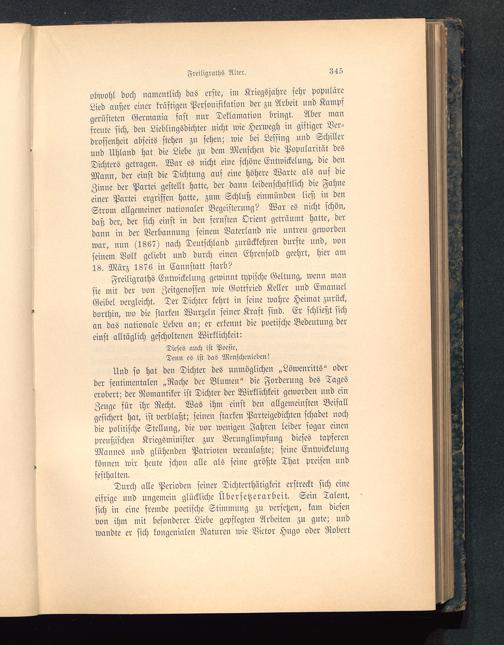 Freiligraths Entwickelung gewinnt typische Geltung, wenn mansie mit der von Zeitgenossen wie Gottfried Keller und EmanuelGeibel vergleicht. Der Dichter kehrt in seine wahre Heimat zurück,dorthin, wo die starken Wurzeln seiner Kraft sind. Er schließt sichan das nationale Leben an; er erkennt die poetische Bedeutung dereinst alitäglich gescholtenen Wirklichkeit: