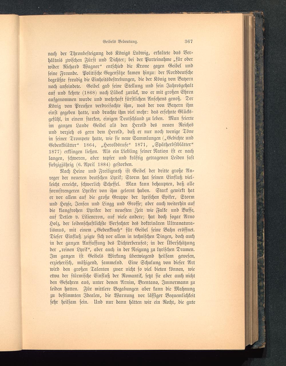 nach der Thronbesteigung des Königs Ludwig, erkaltete das Ver-hältnis zwischen Fürst und Dichter; bei der Parteinahme „für oderWider Richard Wagner" entschied die Krone gegen Geibel undseine Freunde. Politische Gegensatze kamen hinzu: der Norddeutschebegrüßte freudig die Einheitsbestrebungen, die der König von Bayernnoch anfeindete. Geibel gab seine Stellung und sein Jahresgehaltauf und kehrte (1868) nach Lübeck zurück, wo er mit großen Ehrenaufgenommen wurde und wahrhaft fürstlichen Ansehens genoß. DerKönig von Preußen verdreifachte ihm, was der von Bayern ihmeinst gegeben hatte, und brachte ihm viel mehr: das ersehnte Glücks-gefühl, in einem starken, einigen Deutschland zu leben. Man feierteim ganzen Lande Geibel als den Herold des neuen Reichesund verzieh es gern dem Herold, daß er nur noch wenige Tönein seiner Trompete hatte, wie sie neue Sammlungen („Gedichte undGcdenkblätter" 1864, „Heroldsrufe" 1871, „Spätherbstblütter"1877) erklingen ließen. Als ein Liebling seiner Nation ist er nachlangen, schweren, aber tapfer und kräftig getragenen Leiden fastsiebzigjährig (6. April 1884) gestorben.