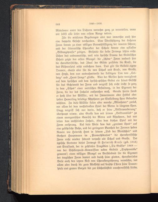 Für die mittleren Begabungen aber war immerhin auch hiereine doppelte Gefahr vorhanden. Eine Überschätzung der äußerenForm konnte zu einer völligen Vernachlässigung der inneren führen;und der litterarische Charakter der Schule konnte eine exklusive„Bildungspoesie" zeitigen. Beispiele für beide Irrwege fehlen nicht.Schon das undramatische, weil rein lyrische Drama der GeibelschenSchule zeigte den ersten Mangel: die „schone" Form verdarb hierdie charakteristische, das Ideal der Glätte zerstörte die Kraft, diedas Bühnenspiel nicht entbehren kann. Das gilt für Geibels eigeneDramen, ebenso aber für die von Schack und Kruse, von Grosse,von Heyse , dem nur ausnahmsweise der kräftigere Ton von „Col-berg" und „Hans Lange" glückte. Aber der Meister hatte wenigstensauf dem lyrischen und dem lyrisch-epischen Gebiet ein feines Gefühlfür das Geheimnis der Form und vergriff sich nicht leicht so ganzin dem „Ethos" einer metrischen Gestaltung, in der Eigenart derForm, die der des Inhalts entsprechen muß. Gerade hieriu stauder hoch über der Willkür, mit der Jmmermann oder Hebbel oderspäter Hamerling beliebige Rhythmen zur Einkleidung ihrer Gedankenwählten. In diese Willkür sielen aber manche „Münchener" zurück,vor allem bei dem wechselvollen Spiel der Metra in längeren Epen.Lingg vergriff sich nnr darin, daß er seine „Völkerwanderung"überhaupt reimte; aber Grosse kam mit seinem „Volkramslied" zueinem unorganischen Gemisch der Metra und Rhythmen, das nurselten dem wechselnden Inhalt, öfter dem bloßen Spiel mit derForm entsprang. Auf diese Weise kam das „gereimte Epos" auseine gefährliche Bahn, und bei geringerer Buntheit der Formen habenNeuere wie Heinrich Hart in seinem „Lied der Menschheit" undGerhart Hauptmann im „ Promethidenlos" die charakteristischeForm nicht minder störend verpaßt als Schack und Grosse. Dertypische Vertreter dieses Irrwegs ist Heinrich Kruse (geb. 1815)aus Stralsund , der in zahllosen Tragödien („Die Gräsin" 1868 —von der Schillerpreis-Kommission neben Geibels „Sophronisbe"genannt!) einen völligen Mangel an Verständnis für die Eigenartder tragischen Form bewies und durch seine glatten, charakterlosenVerse auch den letzten Rest von Charakterzeichnnng verwischte, vorallem aber durch die zarte Rücksicht auf keusche Ohren seine Trauer-spiele aus grauer Vorzeit bis zur Lächerlichkeit anachronistisch färbte.