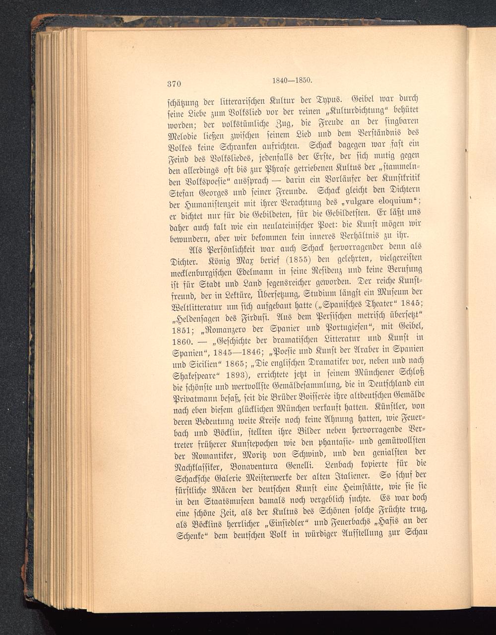 Als Persönlichkeit war auch Schack hervorragender denn alsDichter. König Max berief (1855) den gelehrten, vielgereistenmecklenburgischen Edelmann in seine Residenz und keine Bernfuugist für Stadt und Land segensreicher geworden. Der reiche Kunst-freund, der in Lektüre, Übersetzung, Studium längst ein Museum derWeltlitteratur um sich aufgebant hatte („Spanisches Theater" 1845;„Heldensagen des Firdusi. Aus dem Persischen metrisch übersetzt"1851; „Romauzero der Spanier nnd Portugiesen", mit Geibel,1860. — „Geschichte der dramatischen Litteratur und Kunst inSpanien", 1845—1846; „Poesie und Kunst der Araber in Spanien und Sicilien" 1865; „Die englischen Dramatiker vor, neben und nachShakespeare " 1893), errichtete jetzt in seinem Müucheuer Schloßdie schönste und wertvollste Gemäldesammlung, die in Deutschland einPrivatmann besaß, seit die Brüder Boisseree ihre altdeutschen Gemäldenach eben diesem glücklichen München verkauft hatten. Künstler, vonderen Bedeutung weite Kreise noch keine Ahnung hatten, wie Feuer-bach und Böcklin , stellten ihre Bilder neben hervorragende Ver-treter früherer Kunstepochen wie den Phantasie- und gemütvollstender Romantiker, Moritz von Schwiud, und den genialsten derNachklassiker, Bonaventura Genelli. Lenbach kopierte für dieSchacksche Galerie Meisterwerke der alten Italiener. So schuf derfürstliche Mäcen der deutschen Kunst eiue Heimstätte, wie sie siein den Staatsmuseen damals noch vergeblich suchte. Es war docheine schöne Zeit, als der Kultus des Schönen solche Früchte trug,als Böcktins herrlicher „Einsiedler" und Feuerbachs „Hasis an derSchenke" dem deutschen Volk in würdiger Aufstellung zur Schau