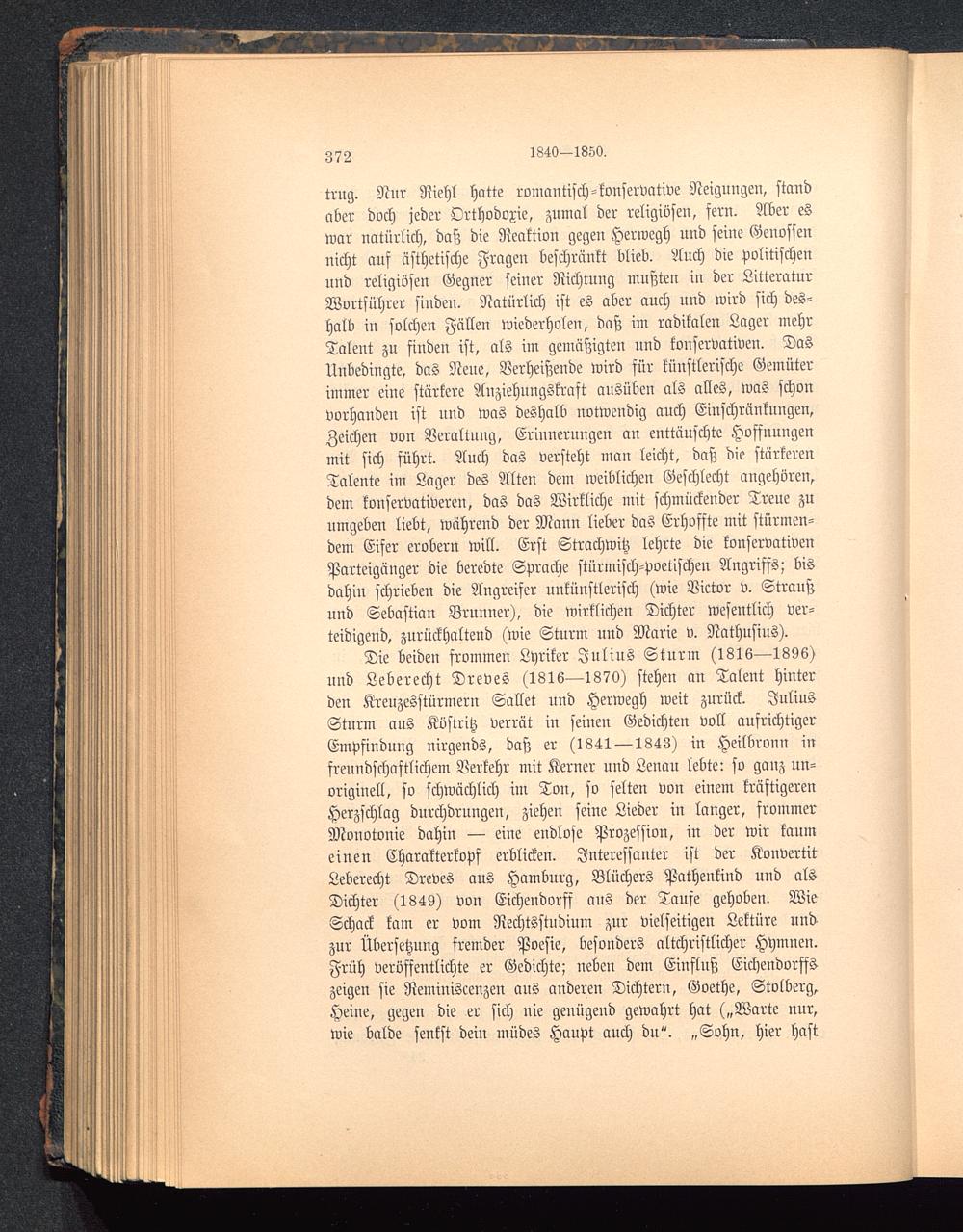 Die beiden frommen Lyriker Julius Sturm (1816—1896)und Leberecht Dreves (1816—1870) stehen an Talent hinterden Kreuzesstürmern Sallet und Herwegh weit zurück. JuliusSturm aus Köstritz verrät in seinen Gedichten voll aufrichtigerEmpfindung nirgends, daß er (1841 —1843) in Heilbronn infreundschaftlichem Verkehr mit Kerner und Lenau lebte: so ganz un-originell, so schwächlich im Tou, so selten von einem kräftigerenHerzschlag durchdrungen, ziehen seine Lieder in langer, frommerMonotonie dahin — eine endlose Prozession, in der wir kaumeinen Charakterkopf erblicken. Interessanter ist der KonvertitLeberecht Dreves aus Hamburg , Blüchers Pathenkind und alsDichter (1849) von Eichendorff aus der Taufe gehoben. WieSchack kam er vom Nechtsstudium zur vielseitigen Lektüre undzur Übersetzung fremder Poesie, besonders altchriftlicher Hymnen.Früh veröffentlichte er Gedichte; neben dem Einfluß Eichendorffs zeigen sie Reminiscenzen aus anderen Dichtern, Goethe, Stolberg ,Heine, gegen die er sich nie genügend gewahrt hat („Warte nur,wie balde senkst dein müdes Haupt auch du". „Sohn, hier hast