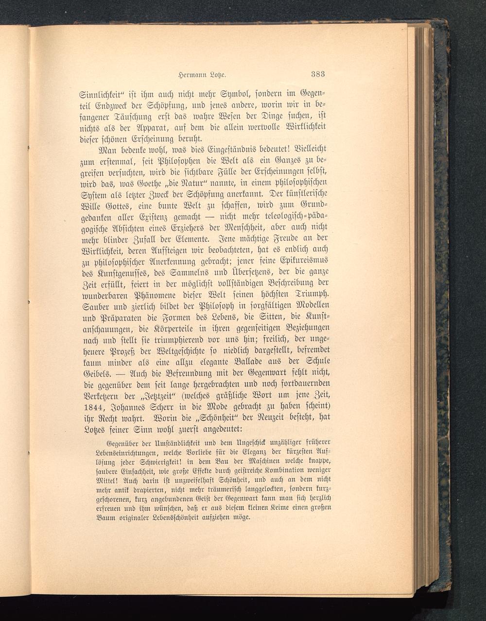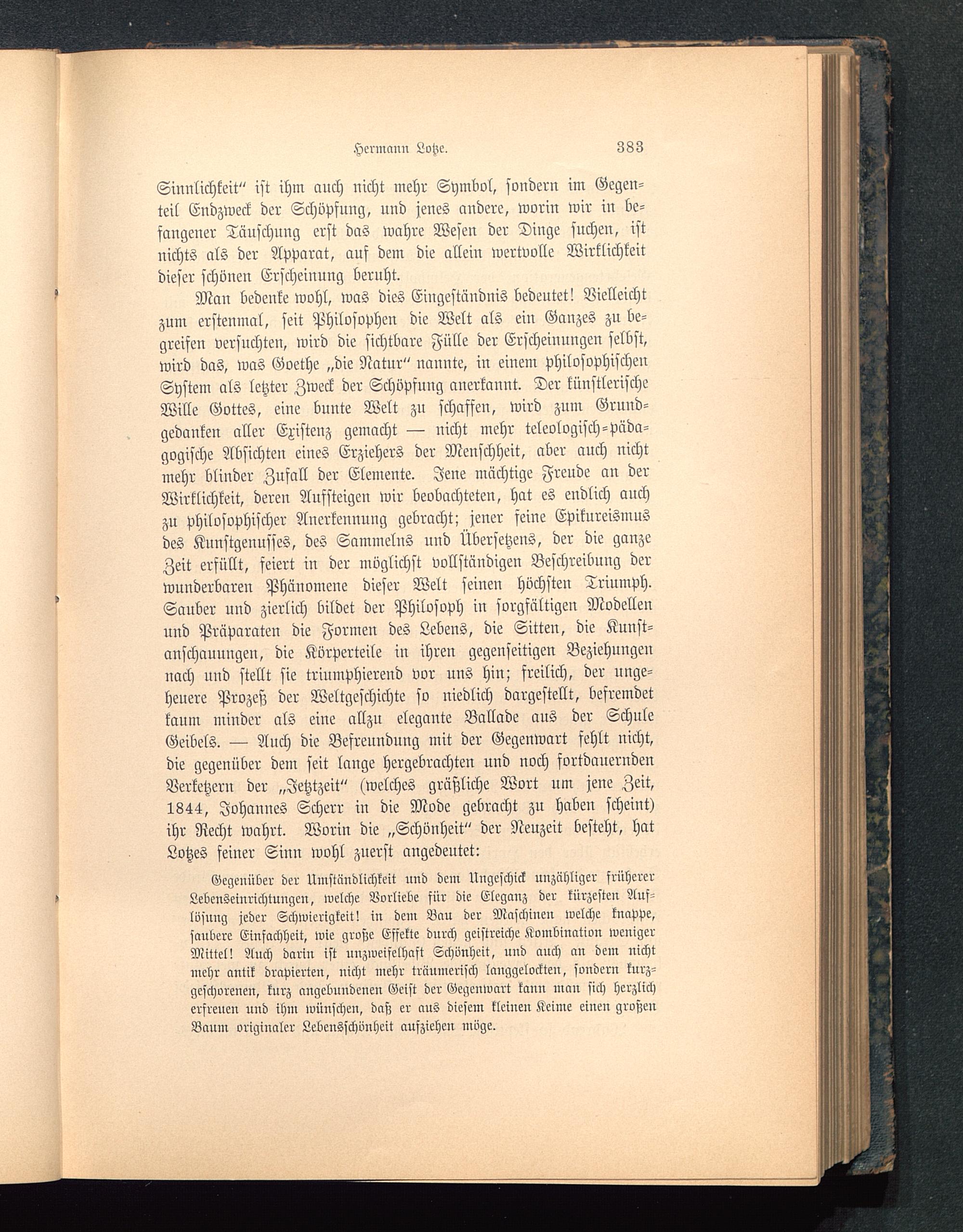 Man bedenke wohl, was dies Eingeständnis bedeutet! Vielleichtzum erstenmal, seit Philosophen die Welt als ein Ganzes zu be-greifen versuchten, wird die sichtbare Fülle der Erscheinungen selbst,wird das, was Goethe „die Natur" nannte, in einem philosophischenSystem als letzter Zweck der Schöpfung anerkannt. Der künstlerischeWille Gottes, eine bunte Welt zu schaffen, wird zum Grund-gedanken aller Existenz gemacht — nicht mehr ideologisch-Päda-gogische Absichten eines Erziehers der Menschheit, aber auch nichtmehr blinder Zufall der Elemente. Jene mächtige Freude an derWirklichkeit, deren Aufsteigen wir beobachteten, hat es endlich auchzu philosophischer Anerkennung gebracht; jener feine Epikureismusdes Kunstgenusses, des Sammelns und Übersetzens, der die ganzeZeit erfüllt, feiert in der möglichst vollständigen Beschreibung derwunderbaren Phänomene dieser Welt seinen höchsten Triumph.Sauber und zierlich bildet der Philosoph in sorgfältigen Modellenund Präparaten die Formen des Lebens, die Sitten, die Kunst-anschaunngen, die Körperteile iu ihren gegenseitigen Beziehnilgennach nnd stellt sie triumphierend vor uns hin; freilich, der unge-heuere Prozeß der Weltgeschichte so niedlich dargestellt, befremdetkaum minder als eine allzu elegante Ballade aus der SchuleGeibels. — Auch die Befreundnng mit der Gegenwart fehlt nicht,die gegenüber dem seit lange hergebrachten und noch fortdanerndenVerketzern der „Jetztzeit" (welches gräßliche Wort um jene Zeit,1844, Johannes Scherr in die Mode gebracht zu haben scheint)ihr Recht wahrt. Worin die „Schönheit" der Neuzeit besteht, hatLotzes feiner Sinn wohl zuerst angedeutet: