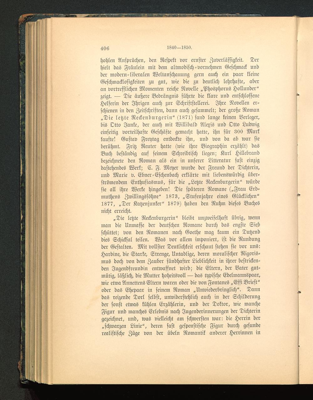 hohlen Ansprüchen, den Respekt vor ernster Zuverlässigkeit. Derhielt das Fräulein mit dem altmodisch-vornehmen Geschmack undder modern-liberalen Weltanschauung gern auch ein paar kleineGeschmacklosigkeiten zu gut, wie die zu deutlich lehrhafte, aberan vortrefflichen Momenten reiche Novelle „Phosphorus Hollundcr"zeigt. — Die äußere Bedrängnis führte die klare und entschlosseneHelferin der Ihrigen auch zur Schriftstellerei. Ihre Novellen er-schienen in den Zeitschriften, dann auch gesammelt; der große Roman„Die letzte Reckenburgerin" (1871) fand lange keinen Verleger,bis Otto Janke, der auch mit Willibald Alexis uud Otto Ludwig einseitig vorteilhafte Geschäfte gemacht hatte, ihn für 300 Markkaufte! Gustav Freytag entdeckte ihn, und von da ab war sieberühmt. Fritz Reuter hatte (wie ihre Biographin erzählt) dasBuch bestündig auf seinem Schreibtisch liegen; Karl Hillebrand bezeichnete den Roman als ein in unserer Litteratur fast einzigdastehendes Werk; C. F. Meyer wurde der Freund der Dichterin,und Marie v. Ebner-Eschenbach erklärte mit liebenswürdig über-strömendem Enthusiasmus, für die „Letzte Reckenburgerin" würdesie all ihre Werke hingeben! Die späteren Romane („Frau Erd-muthens Zwillingssöhne" 1873, „Stufenjahre eines Glücklichen"1877, „Der Katzenjunker" 1879) haben den Ruhm dieses Buchesnicht erreicht.