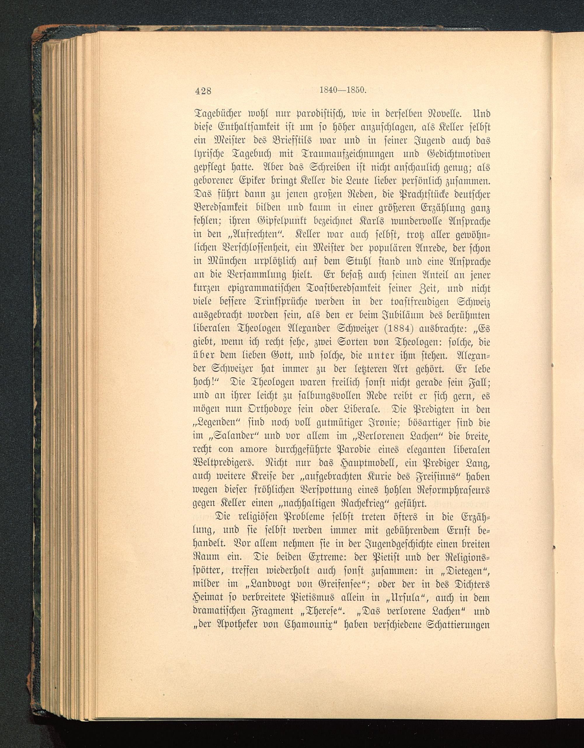 Tagebücher wohl nur Parodiftisch, wie in derselben Novelle. Unddiese Enthaltsamkeit ist um so höher anzuschlagen, als Keller selbstein Meister des Briefstils war und in seiner Jugend auch daslyrische Tagebuch mit Traumaufzeichnungen uud Gedichtmotivengepflegt hatte. Aber das Schreiben ist nicht anschaulich genug; alsgeborener Epiker bringt Keller die Leute lieber persönlich zusammen.Das sührt dann zu jenen großen Reden, die Prachtstücke deutscherBeredsamkeit bilden und kaum iu einer größeren Erzählung ganzfehlen; ihren Gipfelpunkt bezeichnet Karls wundervolle Ansprachein den „Aufrechten". Keller war auch selbst, trotz aller gewöhn-lichen Verschlossenheit, ein Meister der populären Anrede, der schonin München urplötzlich auf dem Stuhl stand und eine Ansprachean die Versammlung hielt. Er besaß auch seiuen Anteil an jenerkurzen epigrammatischen Toastberedsamkeit seiner Zeit, und nichtviele bessere Trinksprüche werden in der toastfreudigen Schweiz ausgebracht worden fein, als den er beim Jubiläum des berühmtenliberalen Theologen Alexander Schweizer (1884) ausbrachte: „Esgiebt, wenn ich recht sehe, zwei Sorten von Theologen: solche, dieüber dem lieben Gott, und solche, die unter ihm stehen. Alexan-der Schweizer hat immer zn der letzteren Art gehört. Er lebehoch!" Die Theologen waren freilich sonst nicht gerade sein Fall;und an ihrer leicht zu salbungsvollen Rede reibt er sich gern, esmögen nun Orthodoxe sein oder Liberale. Die Predigten in den„Legenden" sind noch voll gutmütiger Ironie; bösartiger sind dieim „Salander" und vor allem im „Verlorenen Lachen" die breite,recht oon awors durchgeführte Parodie eiues eleganten liberalenWeltpredigers. Nicht nur das Hanptmodell, ein Prediger Lang,auch weitere Kreise der „aufgebrachten Knrie des Freisinns" habenwegen dieser fröhlichen Verspottung eines hohlen Reformphraseursgegen Keller einen „nachhaltigen Rachekrieg" geführt.