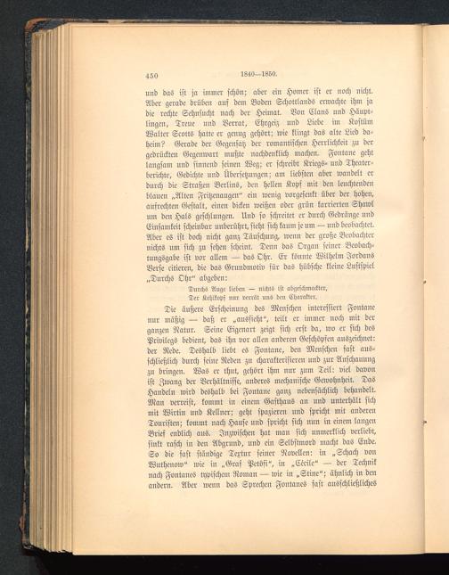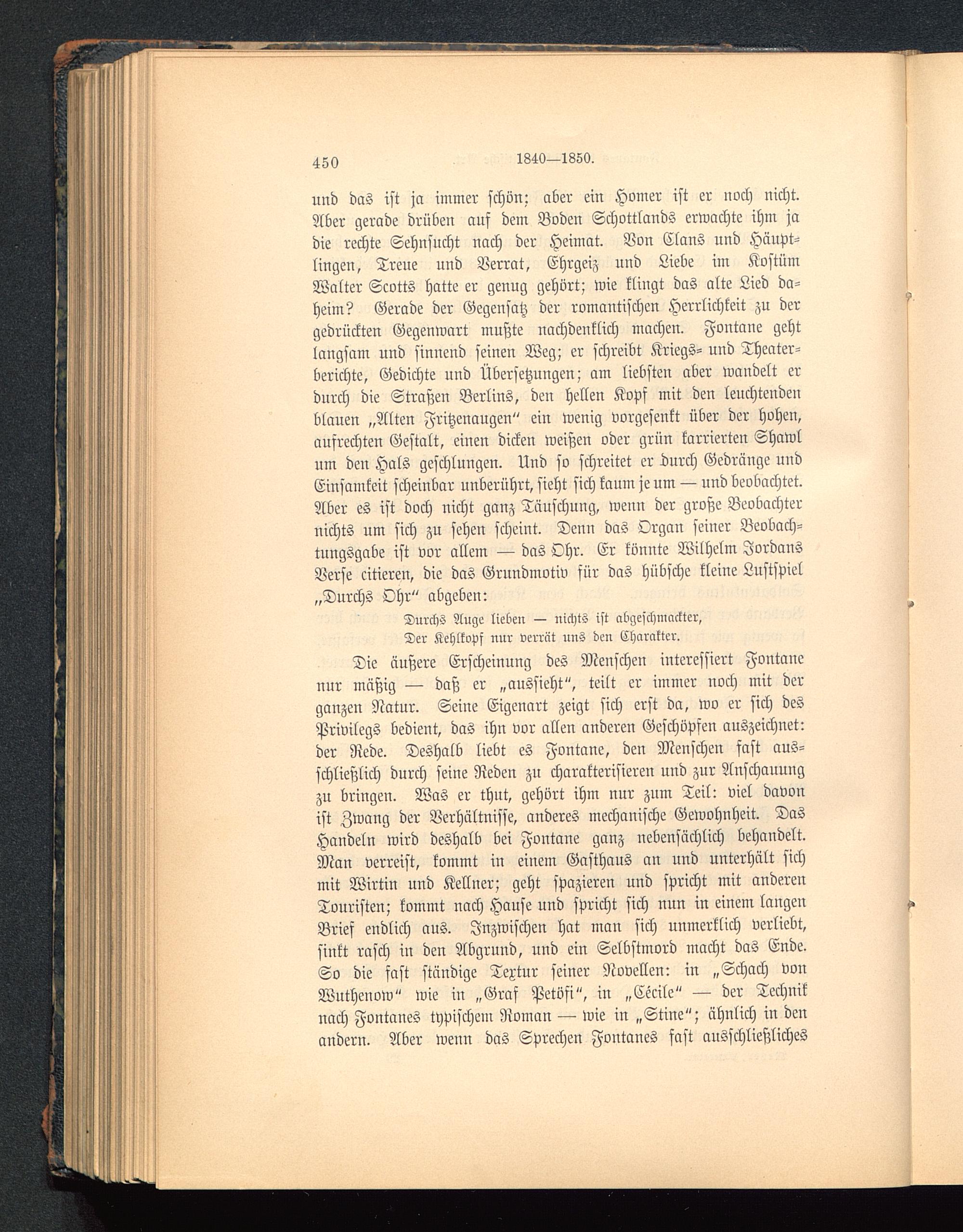 und das ist ja immer schön; aber ein Homer ist er noch nicht.Aber gerade drüben auf dem Boden Schottlands erwachte ihm jadie rechte Sehnsucht nach der Heimat. Von Clans und Häupt-lingen, Treue und Verrat, Ehrgeiz und Liebe im KostümWalter Scotts hatte er genug gehört; wie klingt das alte Lied da-heim? Gerade der Gegensatz der romantischen Herrlichkeit zu dergedrückten Gegenwart mußte nachdenklich machen. Fontane gehtlangsam und sinnend seinen Weg; er schreibt Kriegs- und Theater-berichte, Gedichte und Übersetzungen; am liebsten aber wandelt erdurch die Straßen Berlins , den hellen Kopf mit den leuchtendenblanen „Alten Fritzenaugen" ein wenig vorgesenkt über der hohen,ausrechten Gestalt, einen dicken weißen oder grün karrierten Shawlum den Hals geschlungen. Und so schreitet er durch Gedränge undEinsamkeit scheinbar unberührt, sieht sich kanm je um — und beobachtet.Aber es ist doch nicht ganz Täuschung, wenn der große Beobachternichts um sich zu sehen scheint. Denn das Organ seiner Beobach-tungsgabe ist vor allem — das Ohr. Er könnte Wilhelm Jordans Verse citieren, die das Grnndmotiv sür das hübsche kleine Lustspiel„Durchs Ohr" abgeben: