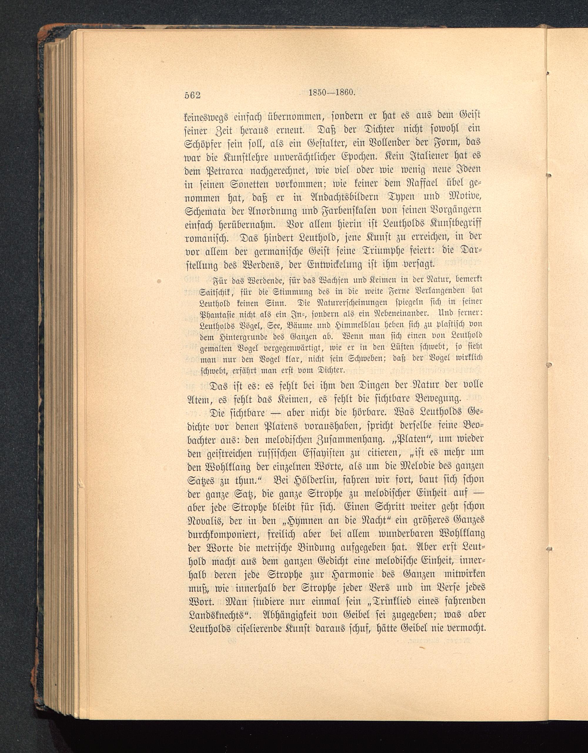 Für das Werdende, für das Wachsen und Keimen in der Natur, bemerktSaitschik, für die Stimmung des in die weite Ferne Verlangenden hatLeuthold keinen Sinn. Die Naturerscheinungen spiegeln sich in seinerPhantasie nicht als ein In-, sondern als ein Nebeneinander. Und ferner:Leutholds Vögel, See, Bäume und Himmelblau heben sich zu Plastisch voudem Hintergrunde des Ganzen ab. Wenn man sich einen von Leutholdgemalten Vogel vergegenwärtigt, wie er in den Lüften schwebt, so siebtman nur den Vogel klar, nicht sein Schweben: dasz der Vogel wirklichschwebt, erfährt man erst vom Dichter.