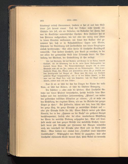 keineswegs einfach übernommen, sondern er hat es aus dem Geistseiner Zeit heraus erneut. Daß der Dichter nicht sowohl einSchöpfer sein soll, als ein Gestalter, ein Vollender der Form, daswar die Kunstlehre unverächtlicher Epochen. Kein Italiener hat esdem Petrarca nachgerechnet, wie viel oder wie wenig neue Ideenin seinen Sonetten vorkommen; wie keiner dem Raffael übel ge-nommen hat, daß er in Andachtsbildern Typen und Motive,Schemata der Anordnung und Farbenskalen von seinen Vorgängerneinfach herübernahm. Vor allem hierin ist Leutholds Kunstbegriffromanisch. Das hindert Leuthold, jene Kunst zu erreichen, in dervor allem der germanische Geist seine Triumphe feiert: die Dar-stellung des Werdens, der Entwickelung ist ihm versagt.
