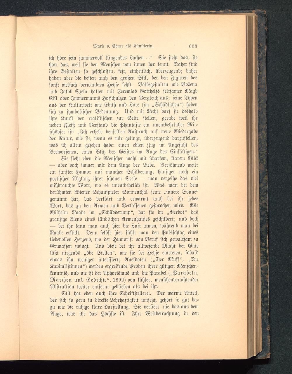 — bei ihr kann man auch hier die Lust atmen, während man beiNaabe erstickt. Denn selbst hier sühlt mau den Pulsschlag einesliebevollen Herzens, wo der Humorist von Beruf sich gewaltsam zuGrimassen zwingt. Und diese bei ihr allwesende Macht der Güteläßt nirgends „öde Stellen", wie sie bei Heyse eintreten, sobaldetwas ihn weniger interssiert; Anekdoten („Der Muff", „DieKapitalistinnen") werden ergreifende Proben ihrer gütigen Menschen-kenntnis, und nie ist der Aphorismus und die Parabel („Parabeln,Märchen und Gedichte", 1892) von kühler, menschenverachtenderAbstraktion weiter entfernt geblieben als bei ihr.