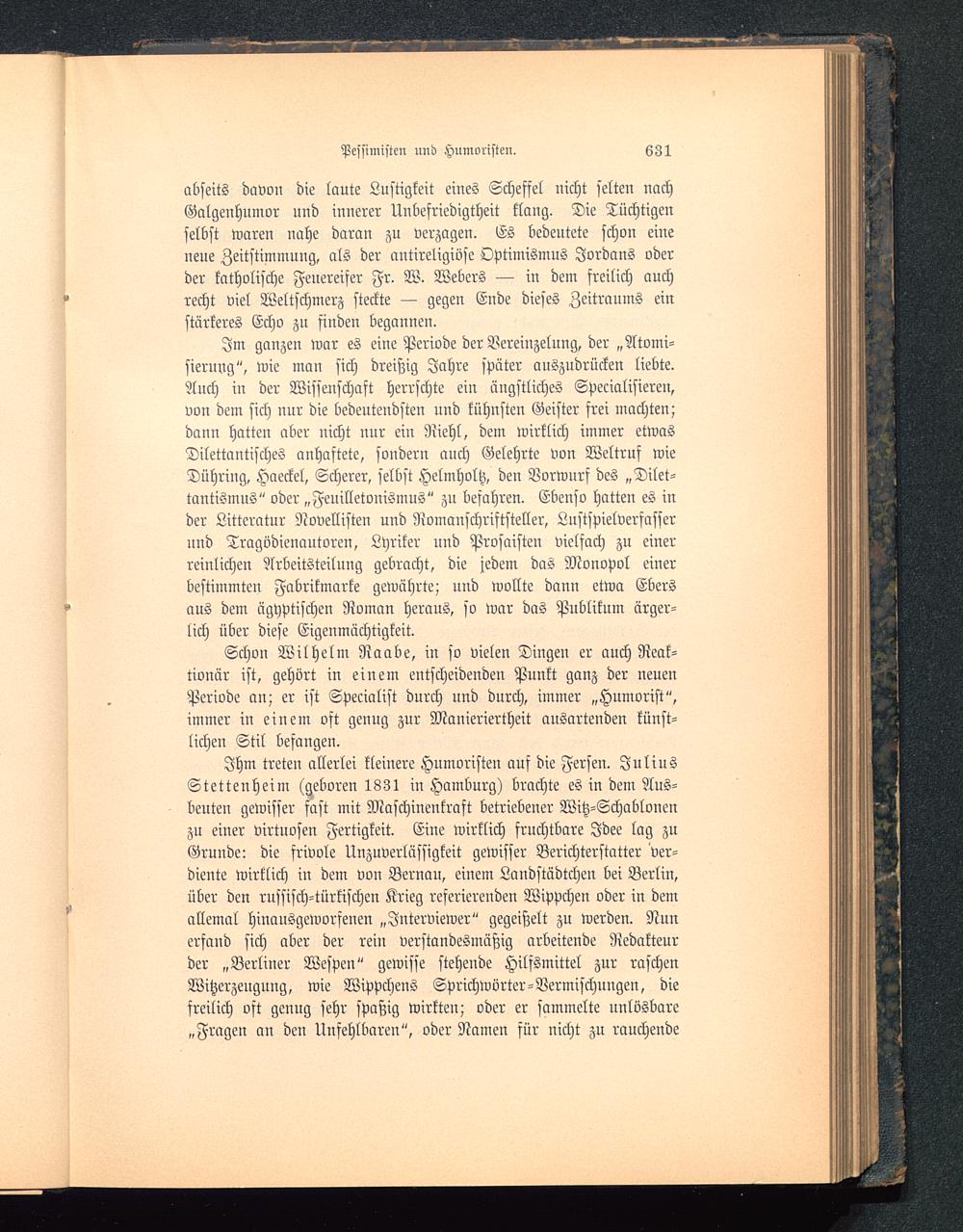 Schon Wilhelm Raabe , in so vielen Dingen er auch Reak-tionär ist, gehört in einem entscheidenden Punkt ganz der neuenPeriode an; er ist Specialist durch und durch, immer „Humorist",immer in einem oft genug zur Manieriertheit ausartenden künst-lichen Stil befangen.